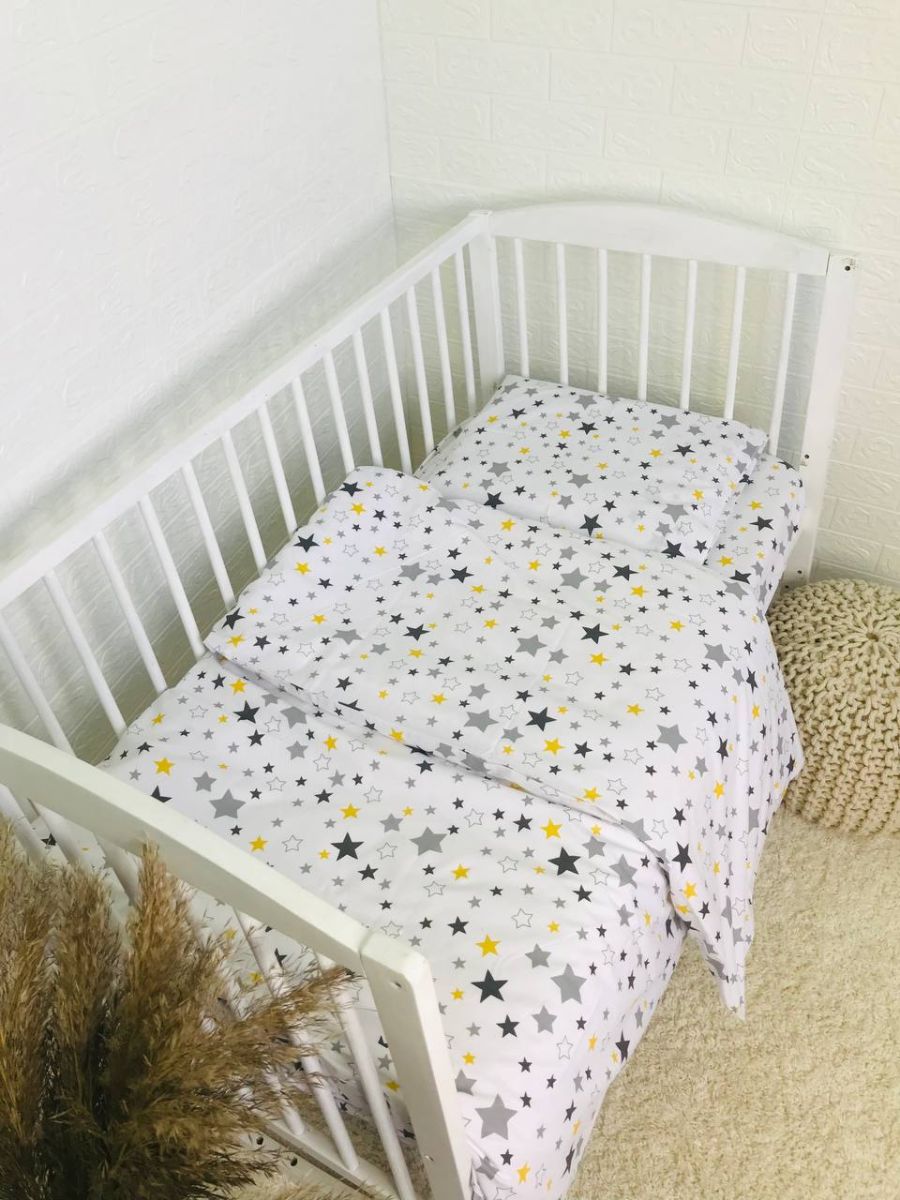 Змінна дитяча постіль, 110 см на 140 см. Принт - Зірки різні з жовтим на білому