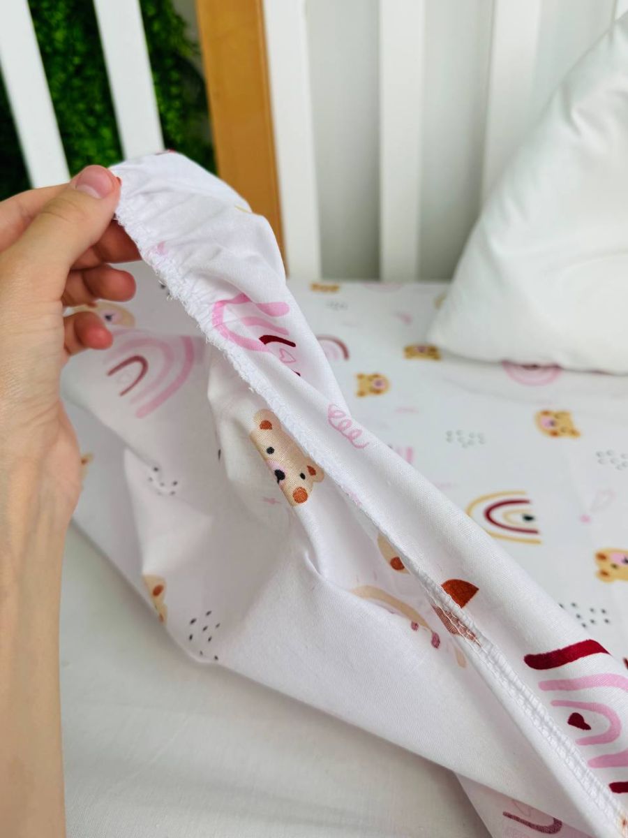 • Простирадло на резинці (120x60 см): Ідеально фіксується на матраці, не сповзає навіть під час активного сну малюка.