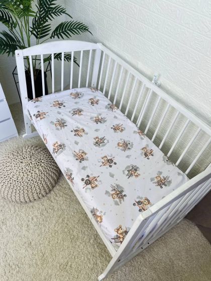 Простирадло легко одягається на матрац, щільно прилягає до його поверхні та не збирається складками. Тканина добре тримає форму, не втрачає м’якості після прання та підходить для щоденного використання. Виріб простий у догляді — його можна прати в пральній машині, і він надовго зберігає свій акуратний вигляд. Ідеальний варіант для дитячого ліжечка вдома.