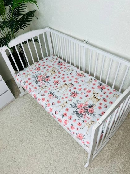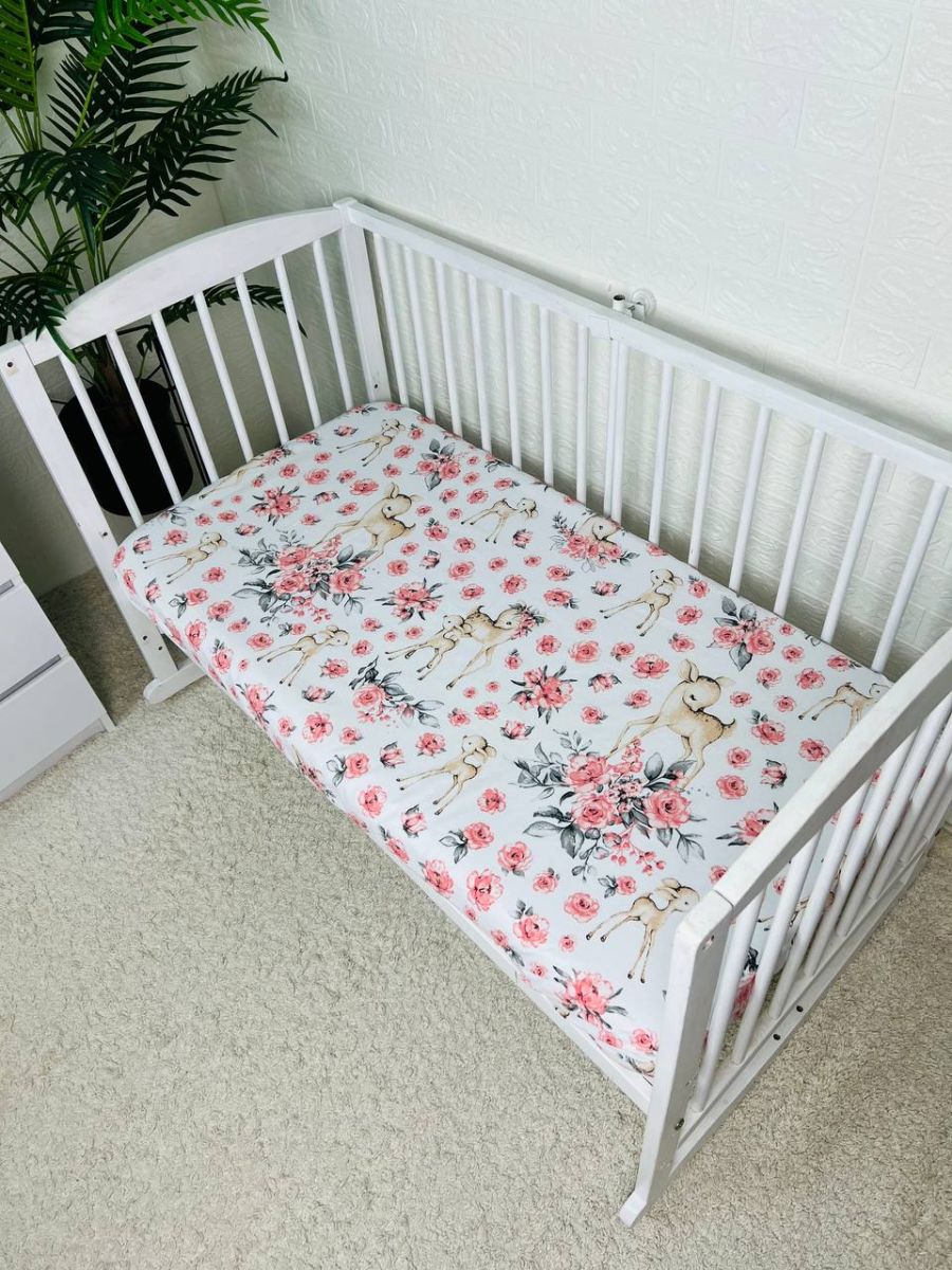 Простирадло легко одягається на матрац, щільно прилягає до його поверхні та не збирається складками. Тканина добре тримає форму, не втрачає м’якості після прання та підходить для щоденного використання. Виріб простий у догляді — його можна прати в пральній машині, і він надовго зберігає свій акуратний вигляд. Ідеальний варіант для дитячого ліжечка вдома.