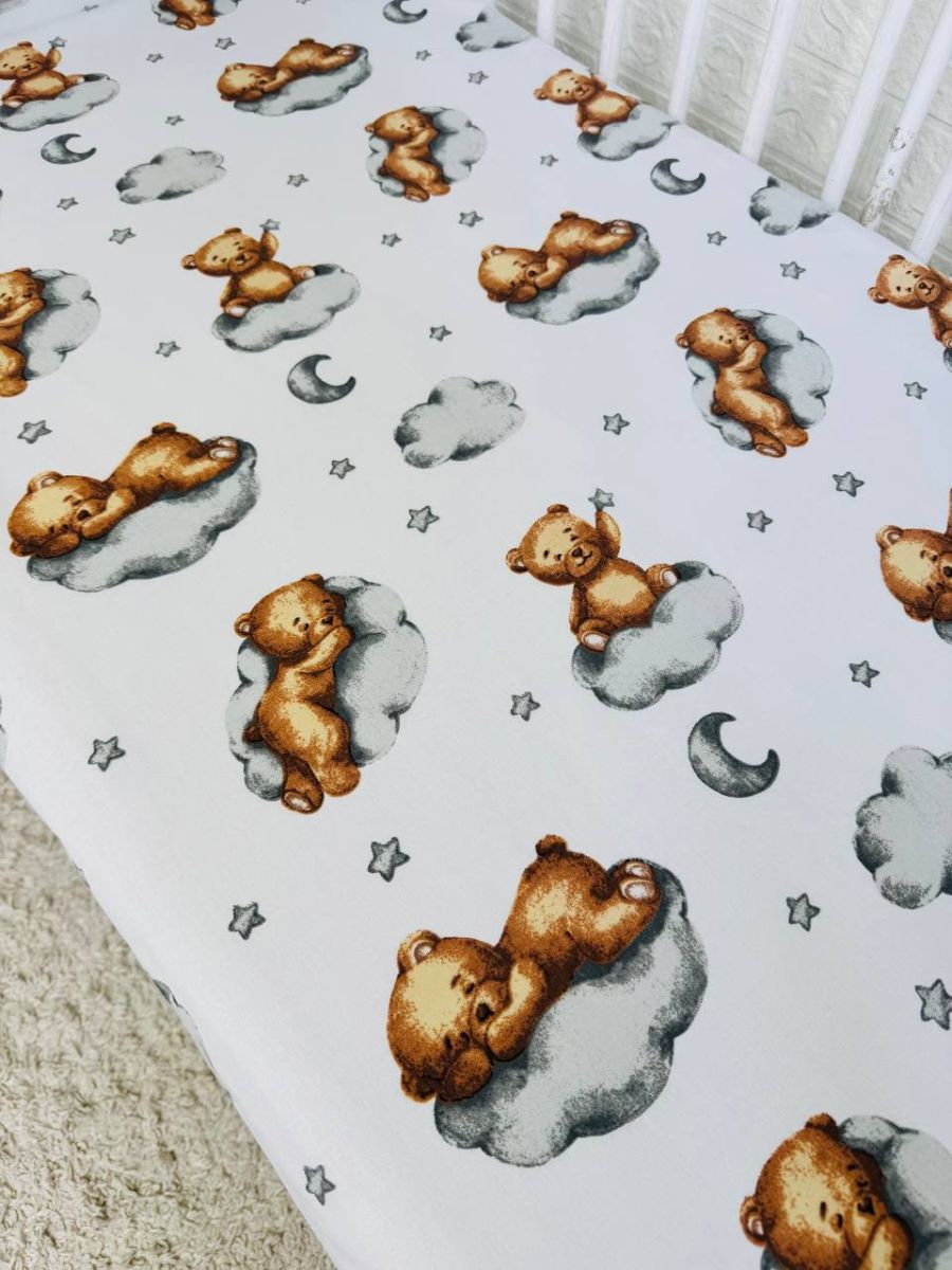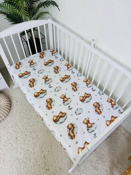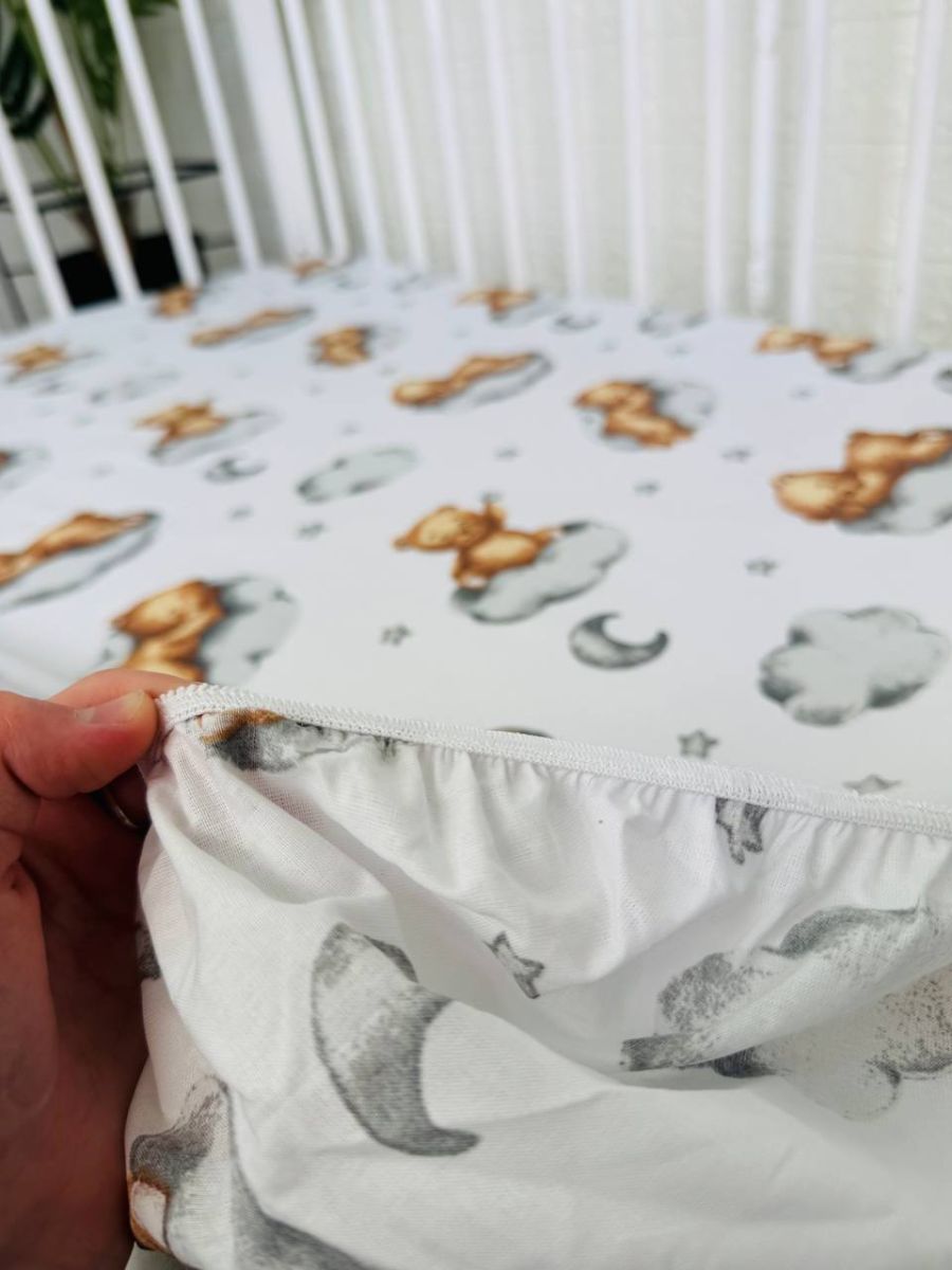 Простирадло легко одягається на матрац, щільно прилягає до його поверхні та не збирається складками. Тканина добре тримає форму, не втрачає м’якості після прання та підходить для щоденного використання. Виріб простий у догляді — його можна прати в пральній машині, і він надовго зберігає свій акуратний вигляд. Ідеальний варіант для дитячого ліжечка вдома.