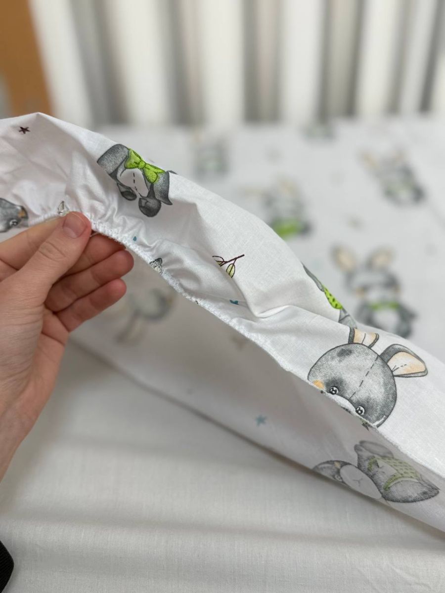 • Простирадло на резинці (120x60 см): Ідеально фіксується на матраці, не сповзає навіть під час активного сну малюка.