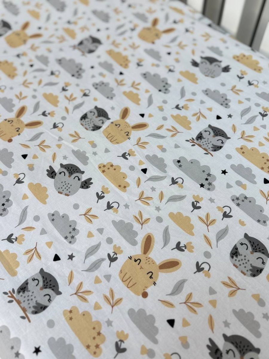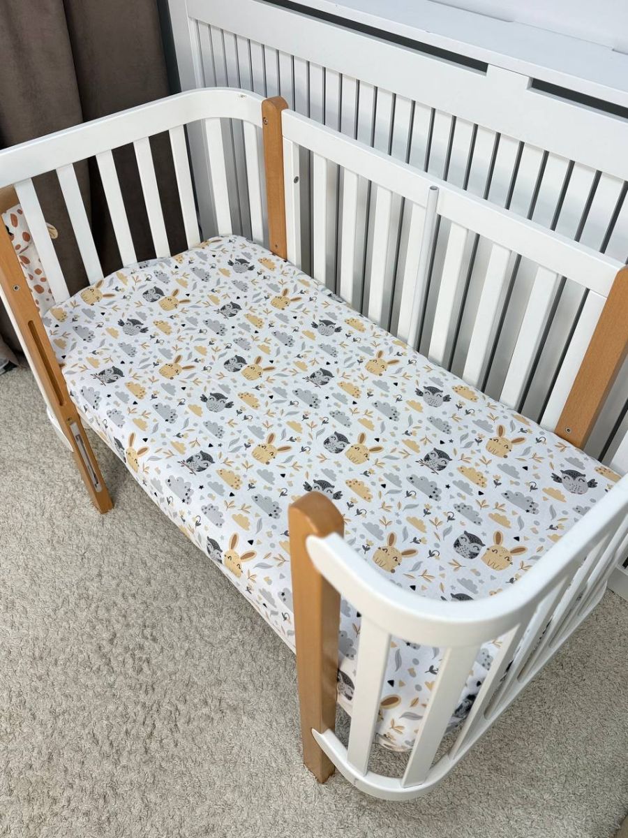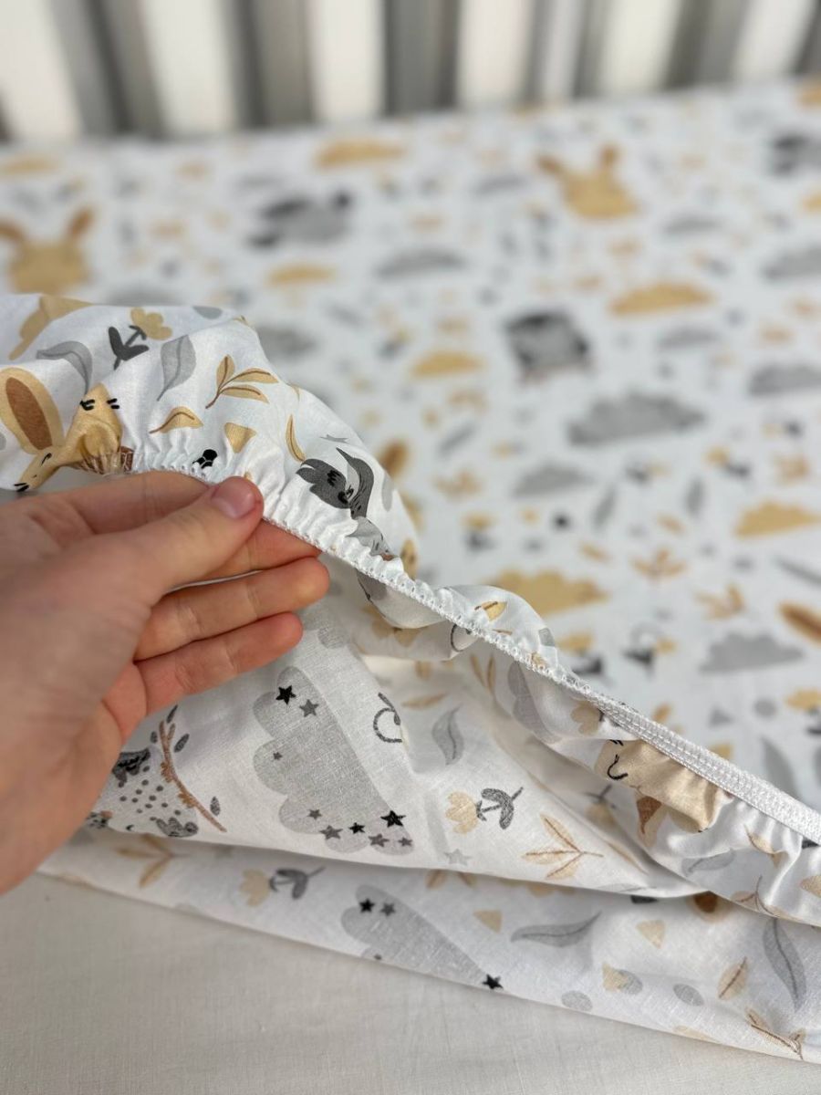 Простирадло легко одягається на матрац, щільно прилягає до його поверхні та не збирається складками. Тканина добре тримає форму, не втрачає м’якості після прання та підходить для щоденного використання. Виріб простий у догляді — його можна прати в пральній машині, і він надовго зберігає свій акуратний вигляд. Ідеальний варіант для дитячого ліжечка вдома.
