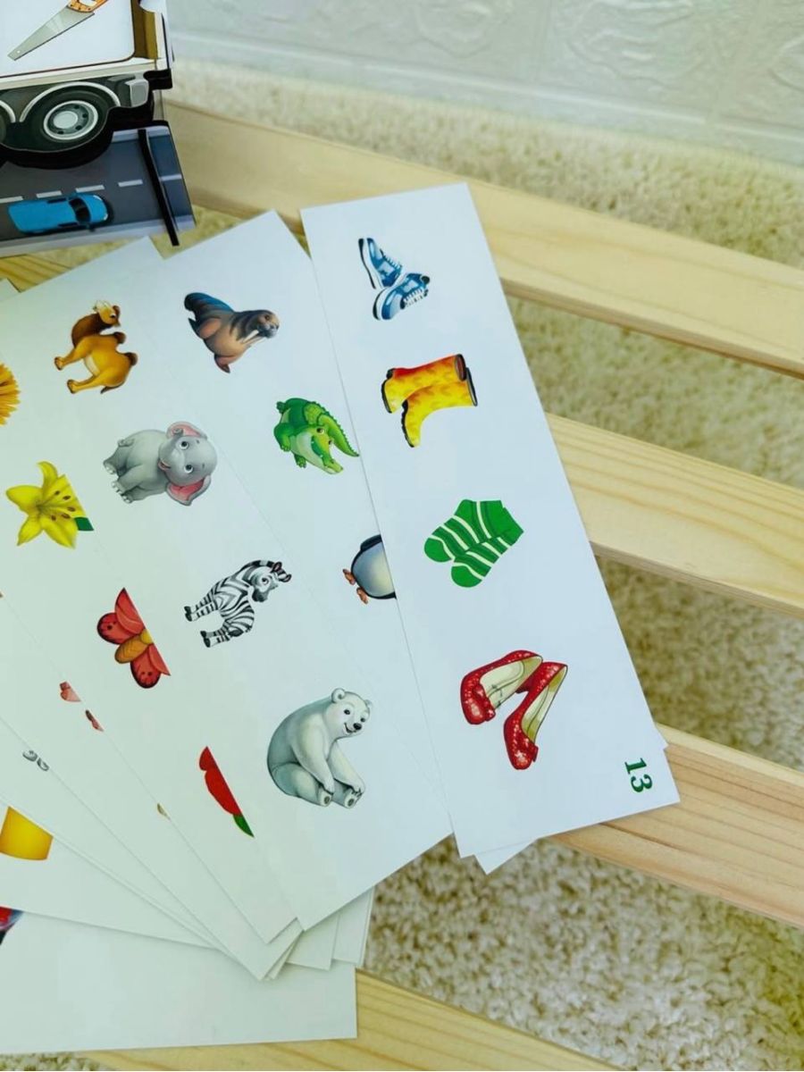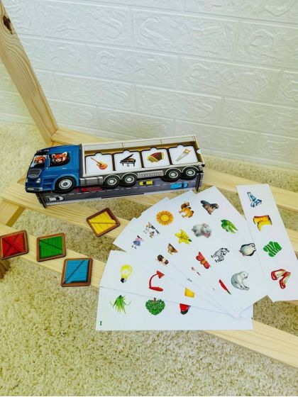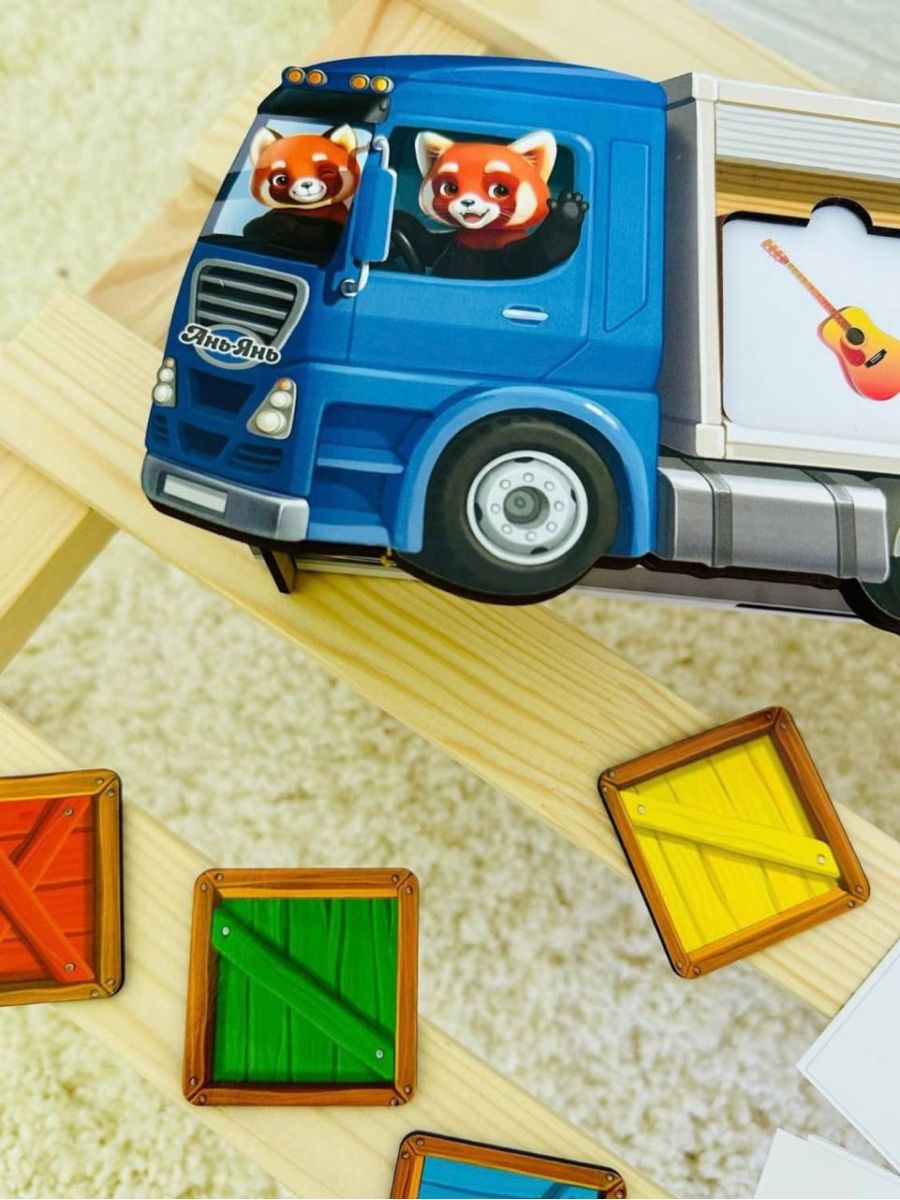 Яскрава розвиваюча гра у вигляді вантажівки з наборами кольорових елементів. Дитина сортує фігури за формою та кольором, розміщуючи їх у відповідні отвори.