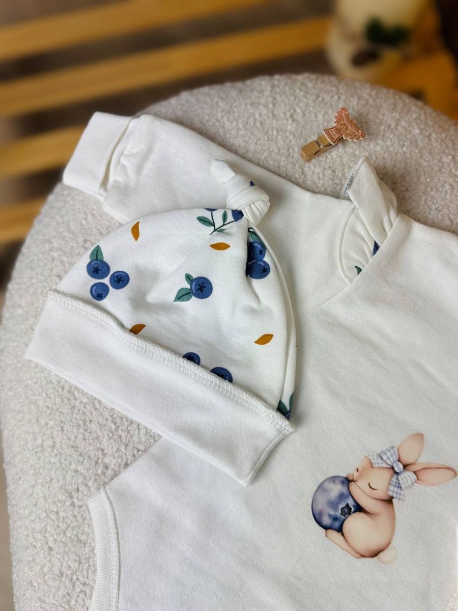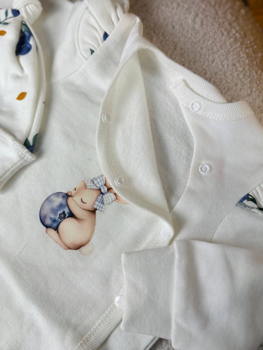👕 Комплектація: боді з кнопками для зручного одягання, м’яка шапочка для захисту голови та вушок, повзунки з еластичною резинкою, що не тисне.