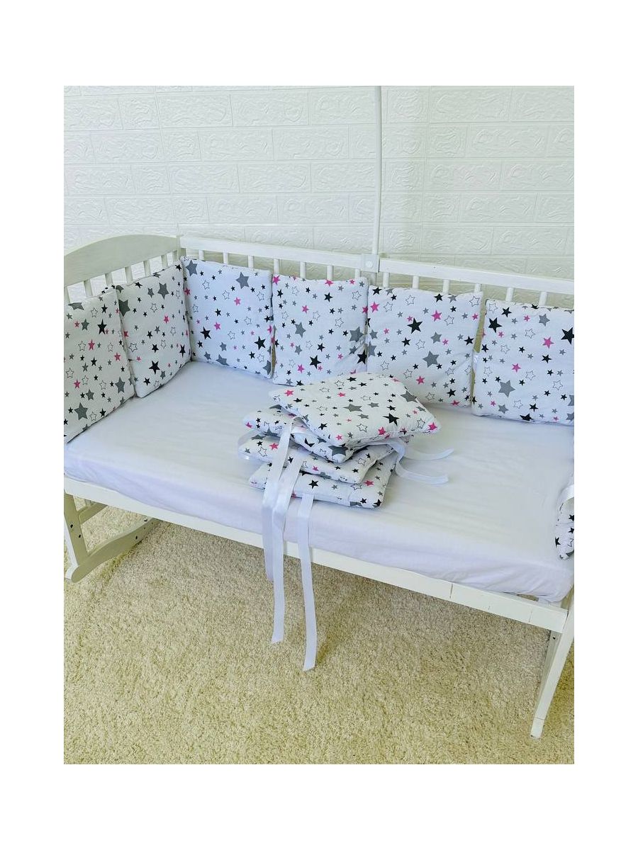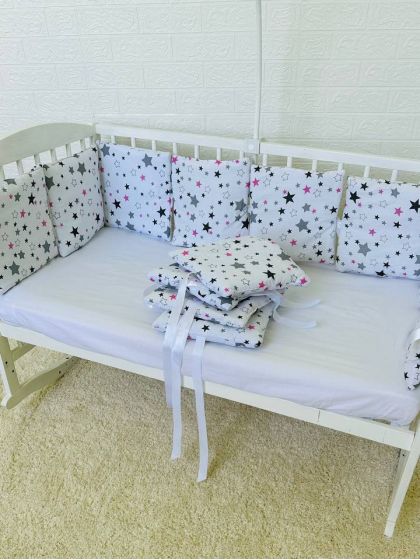 Бортики-подушки на 4 боки ліжечка, 12 подушок. Принт - Зірки різні з рожевим на білому