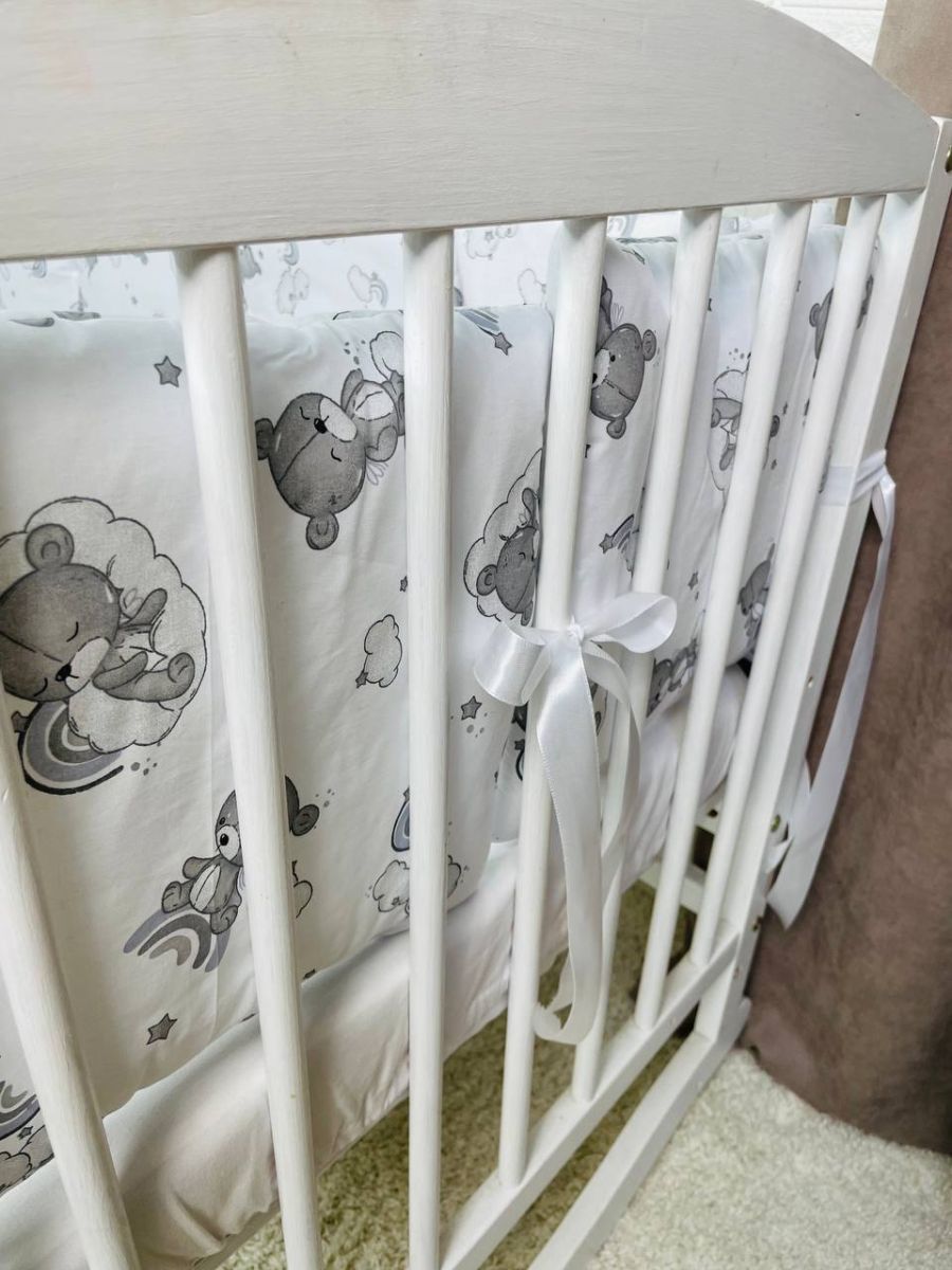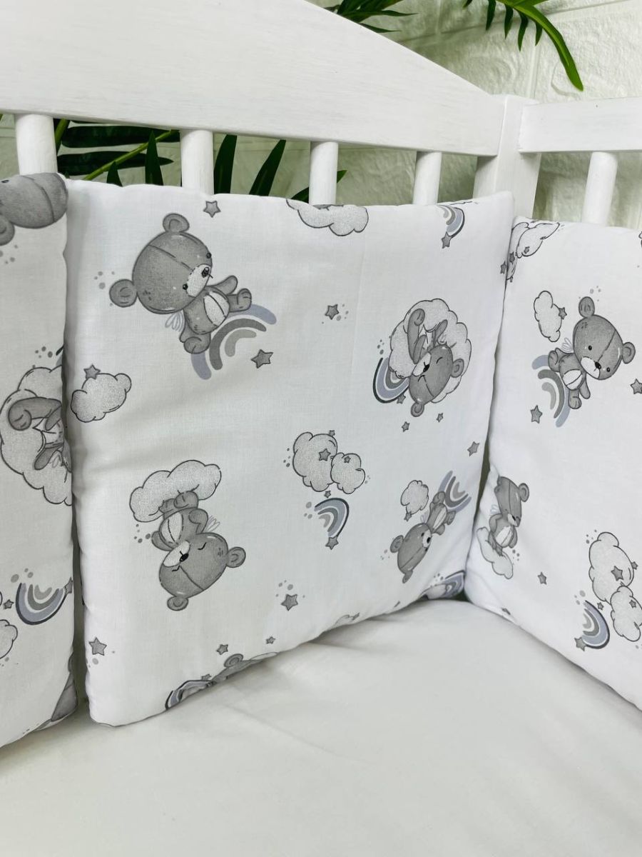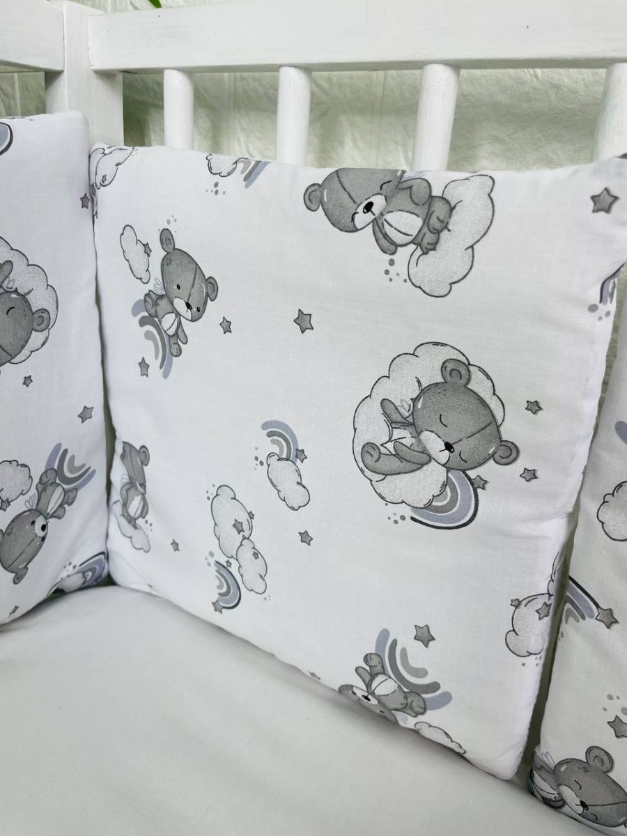 Бортики-подушки на 4 боки ліжечка, 12 подушок. Принт - Ведмедикі сплячі, невзрачні сірі