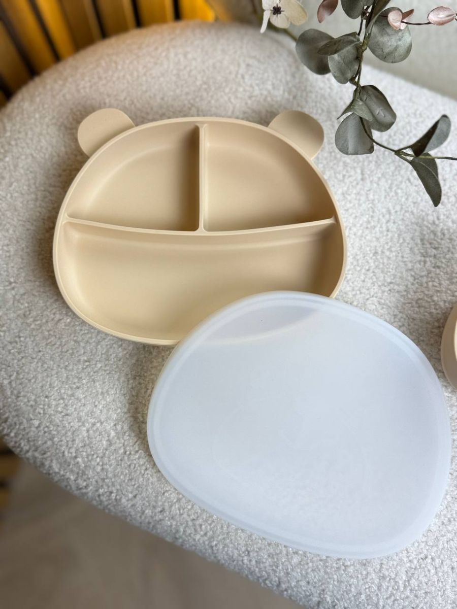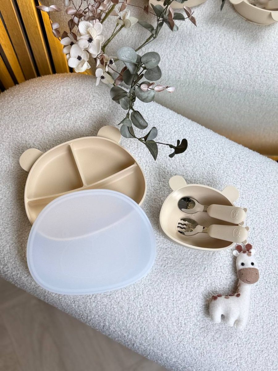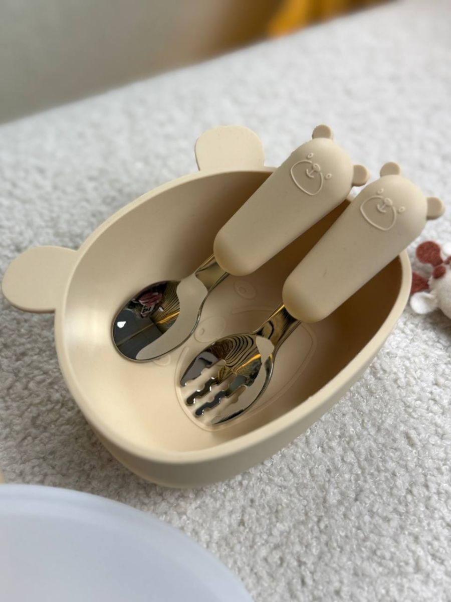 Силіконовий набір дитячого посуду “Ведмеді” з кришкою та металевими приборами. колір - Ivory