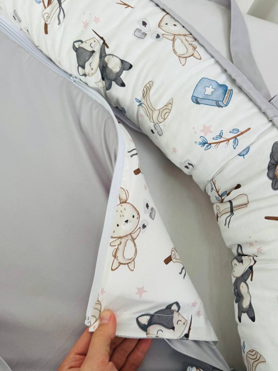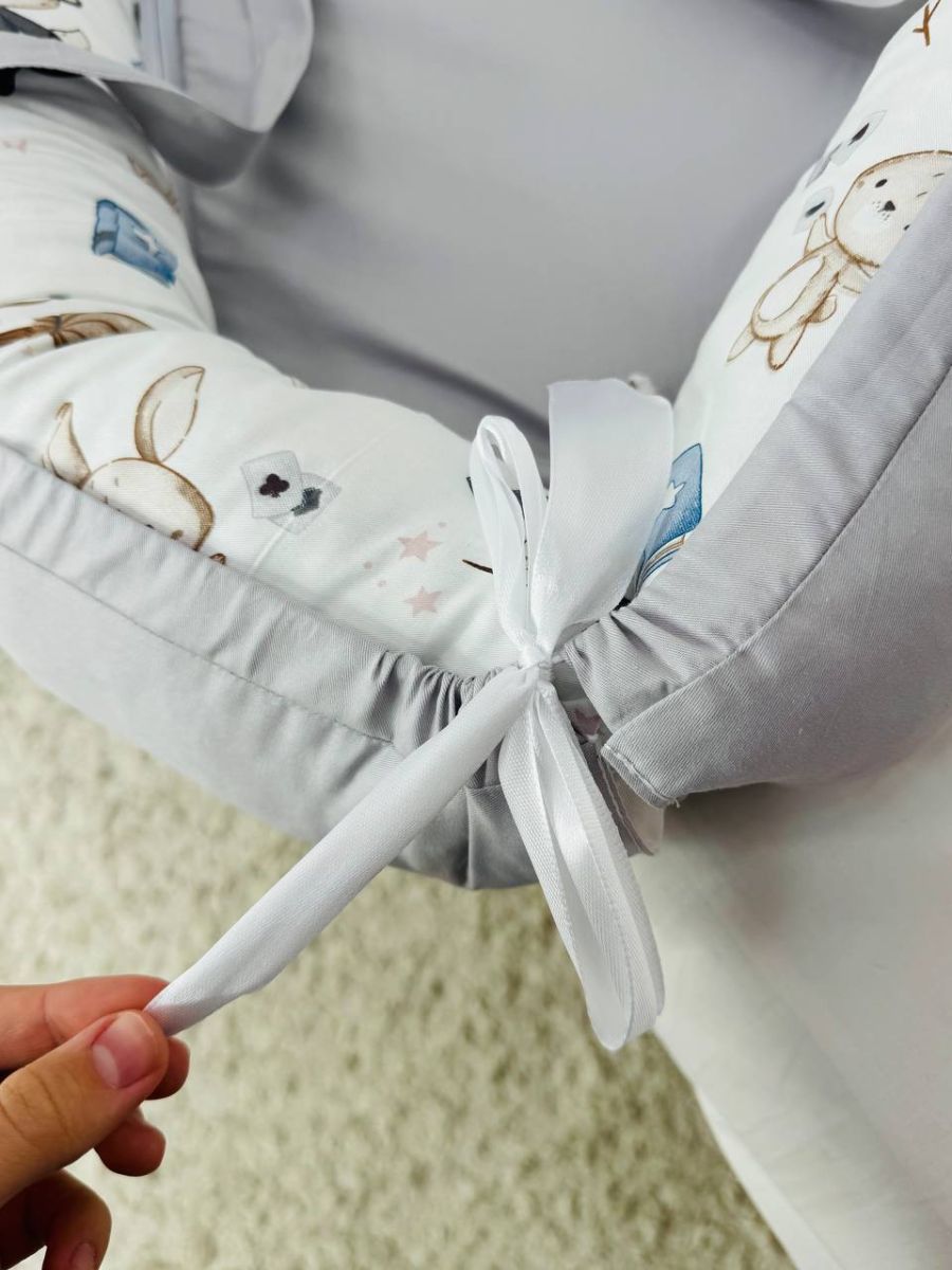Кокон-гніздечко з ручками. Принт - Левеня з зайцем сині, сірий однотон.