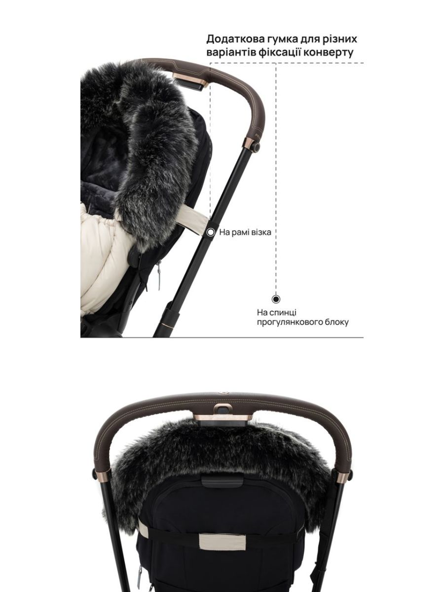 Додатково конверт кріпиться до спинки прогулянкової коляски широкою вставкою на резинці.