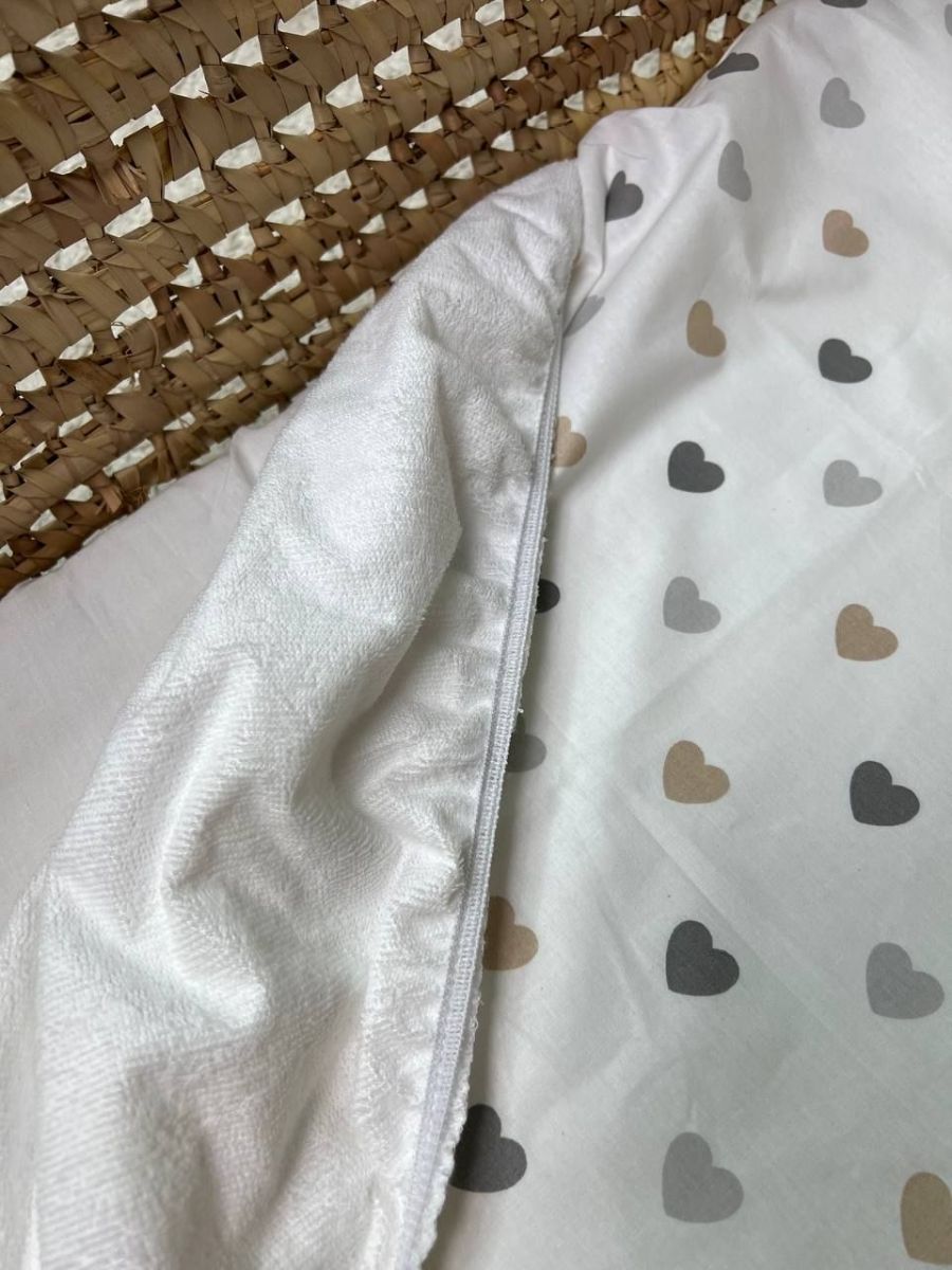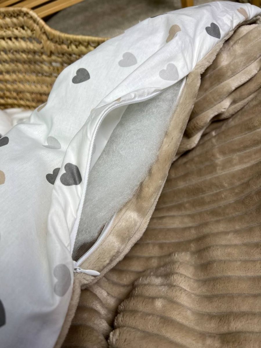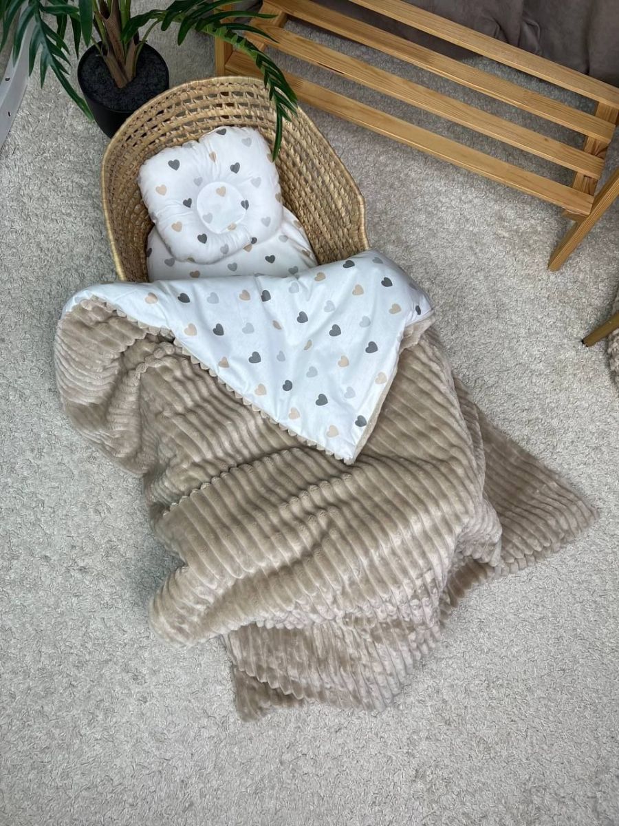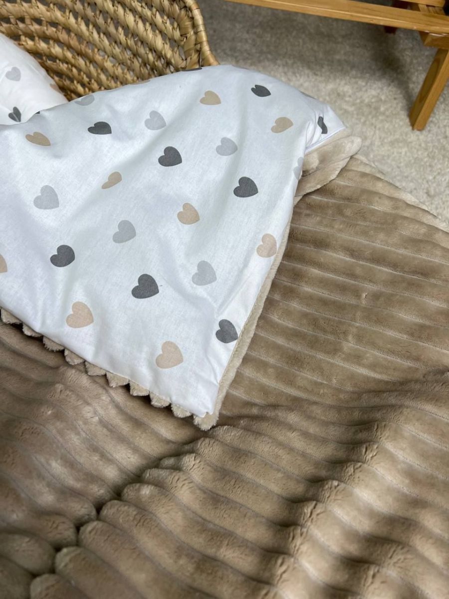 Набір у візочок, простирадло непромакаюче, плед на змійці. Принт - Бежевий плюш шарпей, серця бежеві
