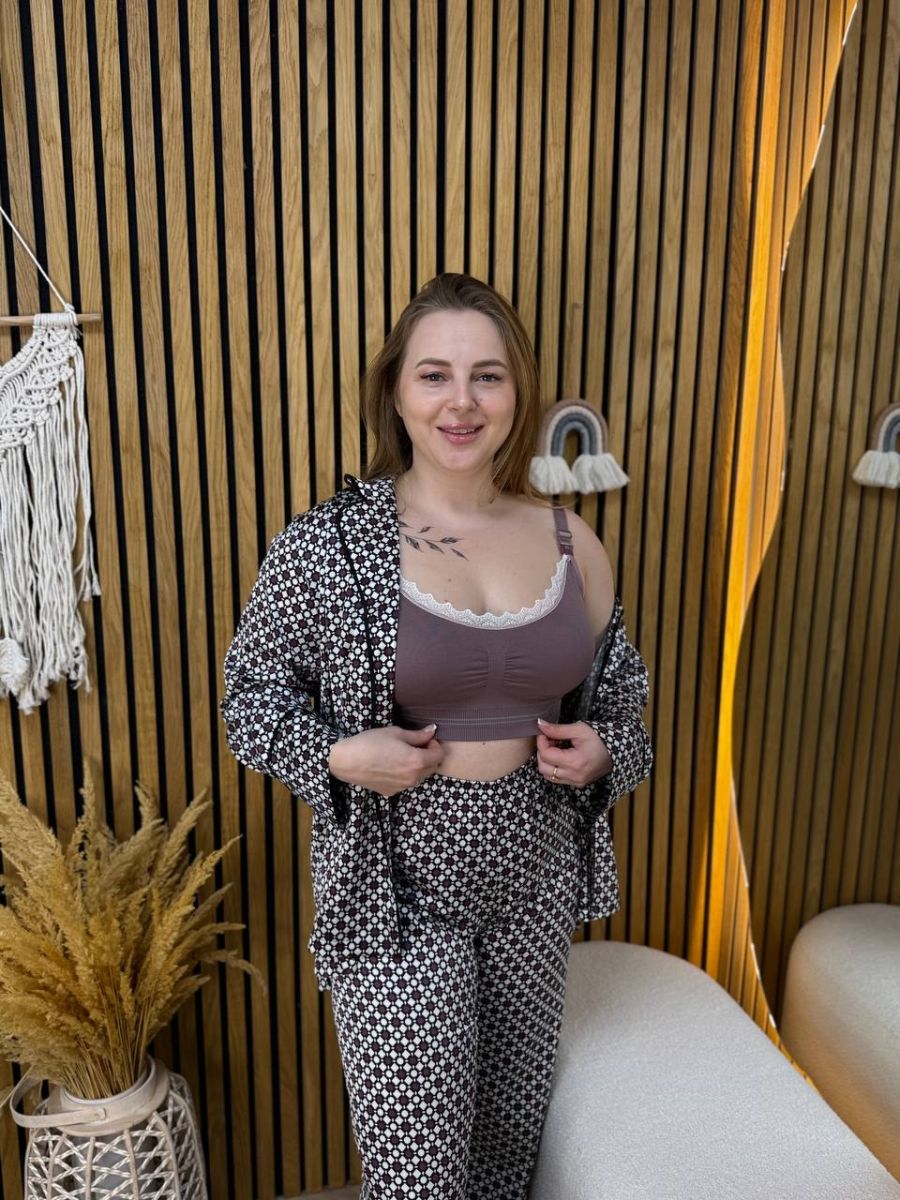 Модель оснащена знімними поролоновими чашками, які за потреби можна замінити на лактаційні вкладки. Відсутність кісточок та бічних швів забезпечує максимальний комфорт, не створюючи тиску на груди. Топ підходить як для щоденного носіння, так і для відпочинку або сну.