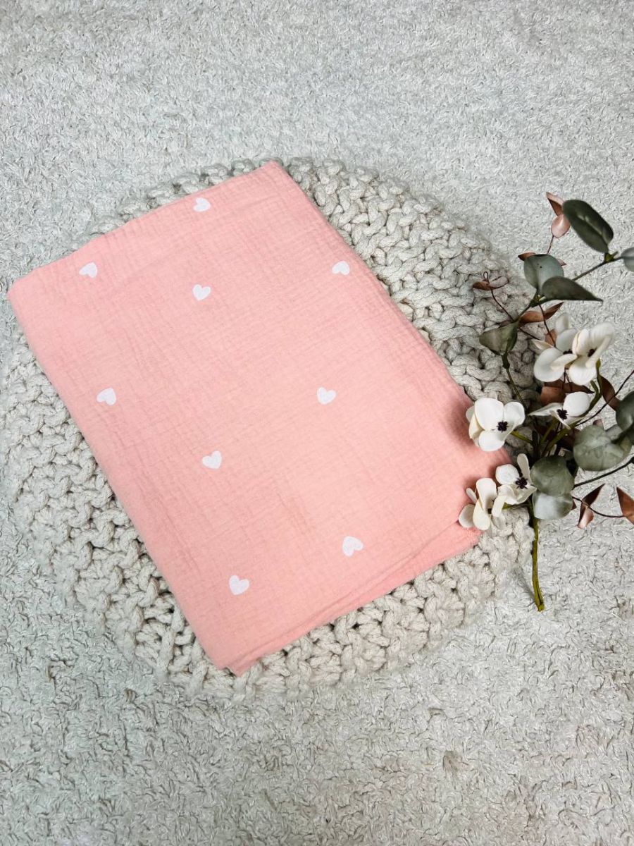 Пелюшки муслінові чотирьохшарові, жатка. Принт - Сердечка на помаранчевому. Розмір - 90*135см