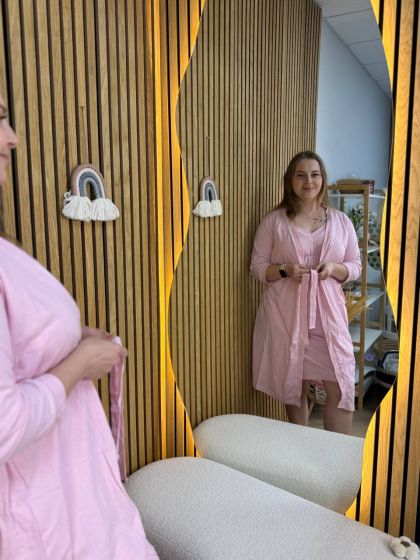 Халат доповнює комплект і створює затишний домашній образ. Модель із поясом добре сідає по фігурі, не обмежує рухів та підкреслює жіночність. Натуральна бавовна легка, приємна до тіла й чудово підходить для щоденного носіння.