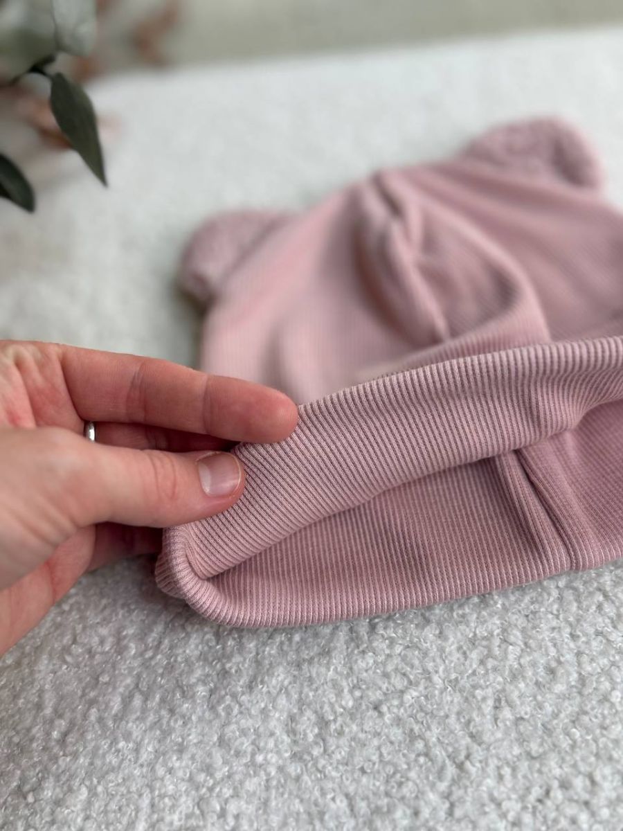 Модель виконана з м’якого, приємного до тіла трикотажу, який добре тягнеться та комфортно облягає голову дитини. Подвійний шар тканини забезпечує додаткове тепло та захист від вітру. Оригінальні об’ємні вушка додають образу ніжності та роблять шапочку особливо милою.