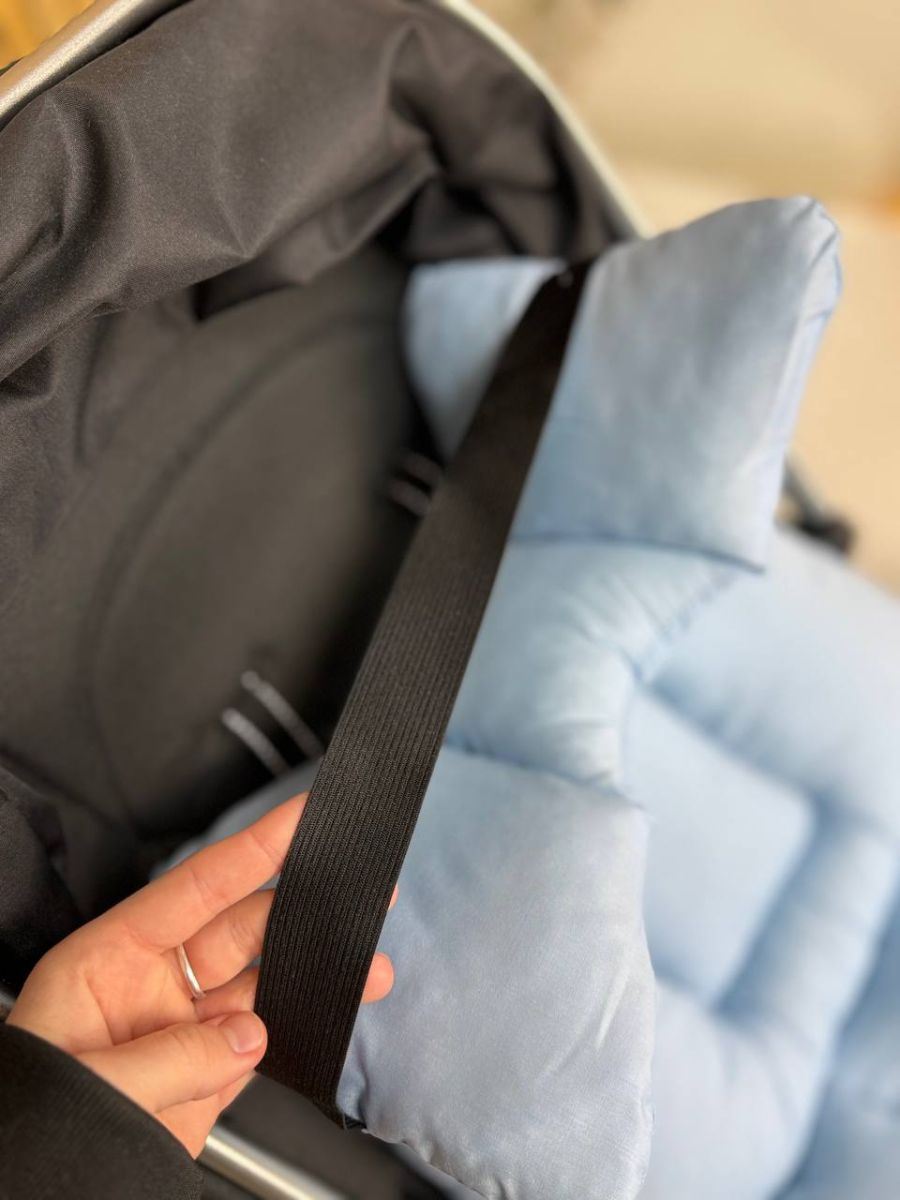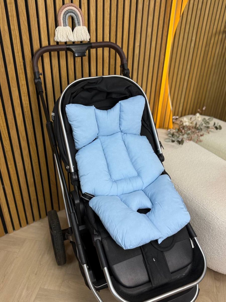 • Практичне кріплення: Гумка на зворотному боці забезпечує надійну фіксацію на колясці, а вирізи під 5-точкові ремені безпеки гарантують сумісність із різними моделями крісел.