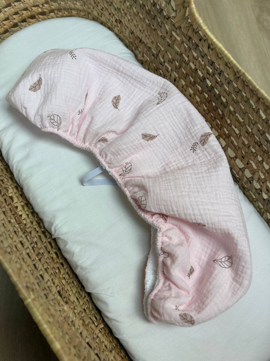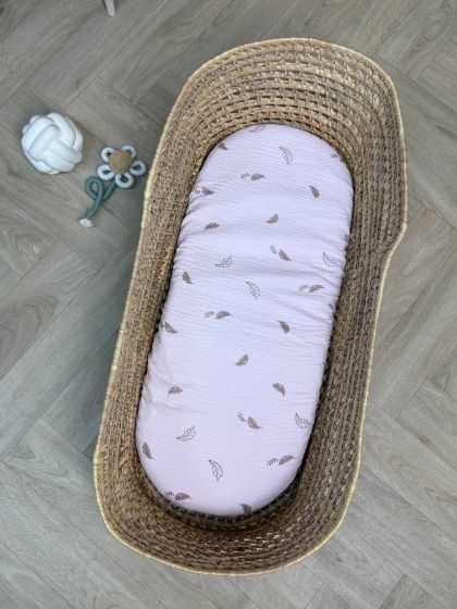 Простирадло муслін непромакаюче у візочок на гумці. Колір - Контур листя на ніжно рожевому