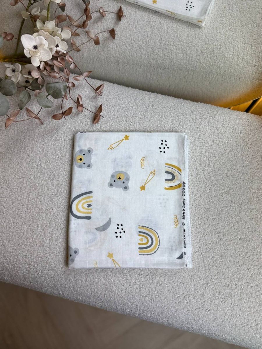 • Прання: Пелюшки та пледи з натуральних тканин (бавовна, муслін, фланель) рекомендується прати при температурі не вище 40°C, ручне прання. Це допоможе зберегти їх м’якість і не порушити структуру волокон.