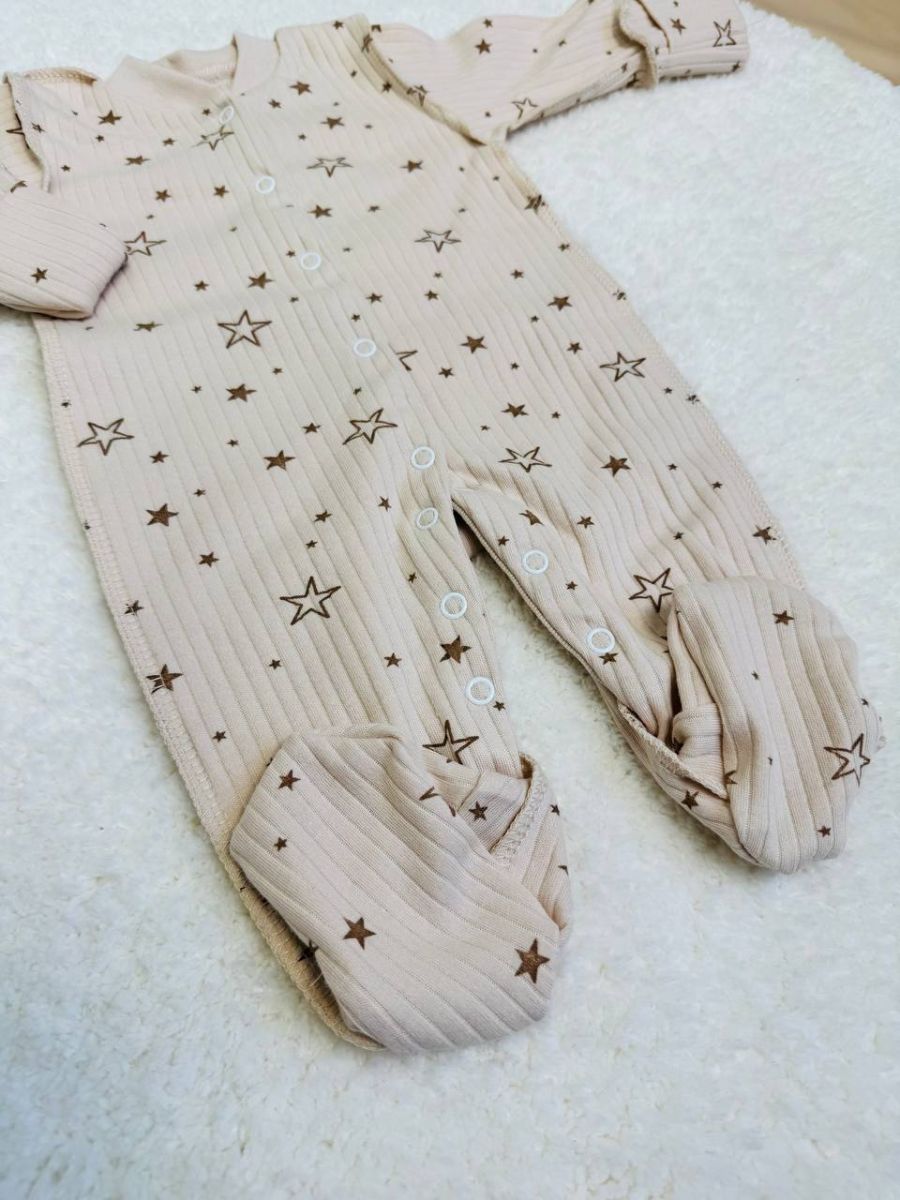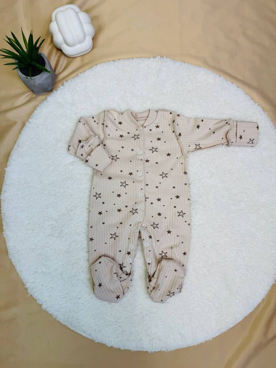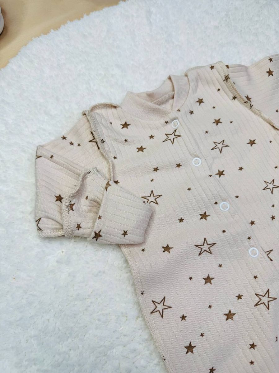 Цей ніжний та затишний комбінезон виконаний у сірому кольорі з милим принтом у вигляді зірочок, що надає йому чарівного вигляду. Він розроблений для забезпечення максимального комфорту та тепла малюку в перші місяці життя.