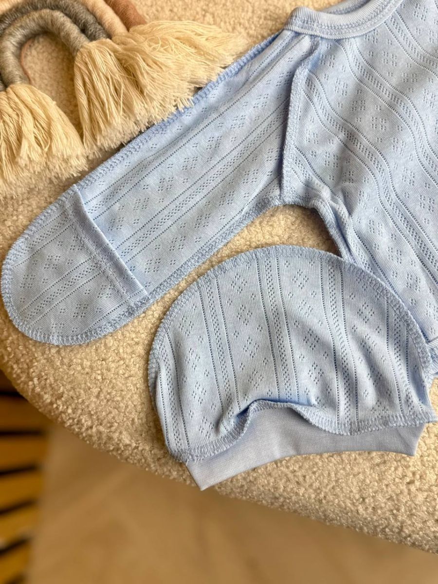 Виготовлений з тканини інтерлок з перфорацією, цей комплект не лише м’який та приємний на дотик, а й дозволяє шкірі малюка дихати, забезпечуючи оптимальну температуру та комфорт в будь-який час року.