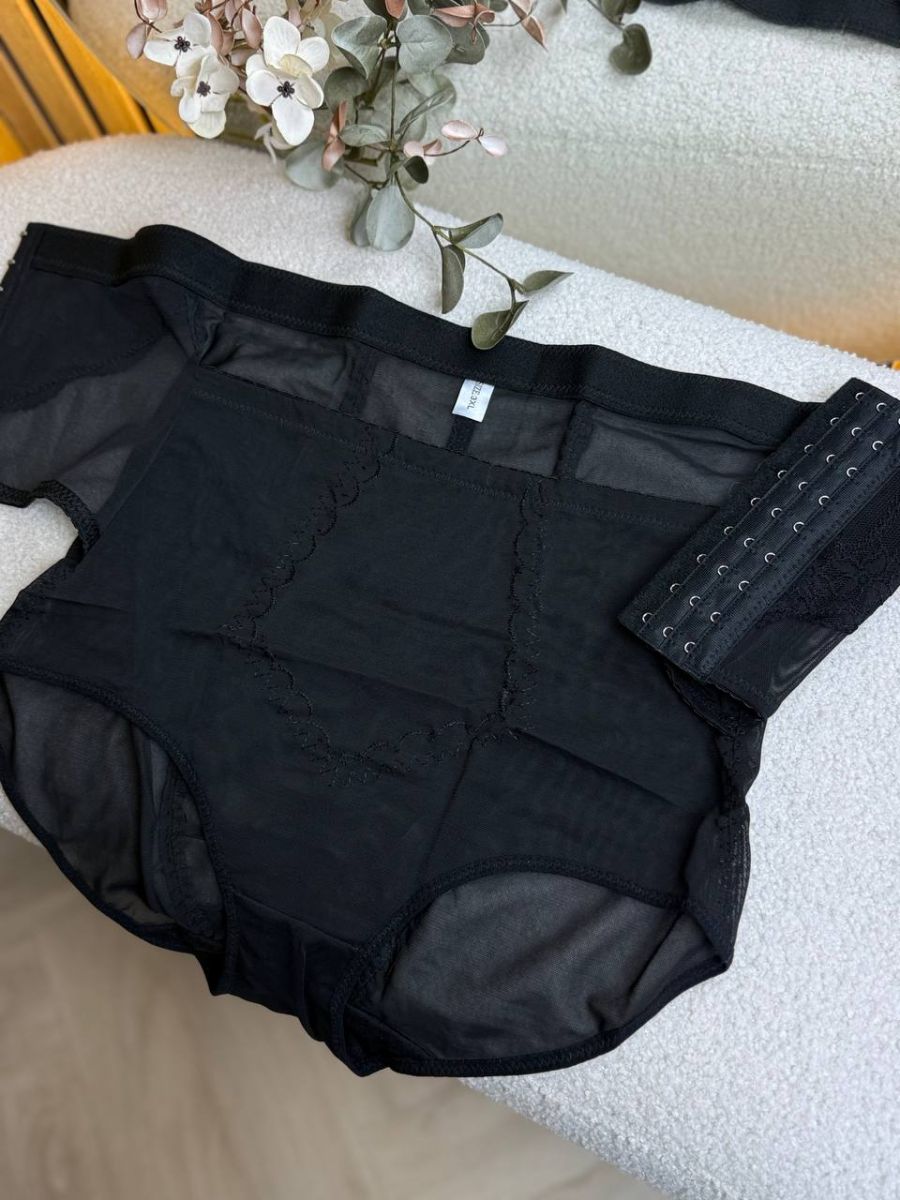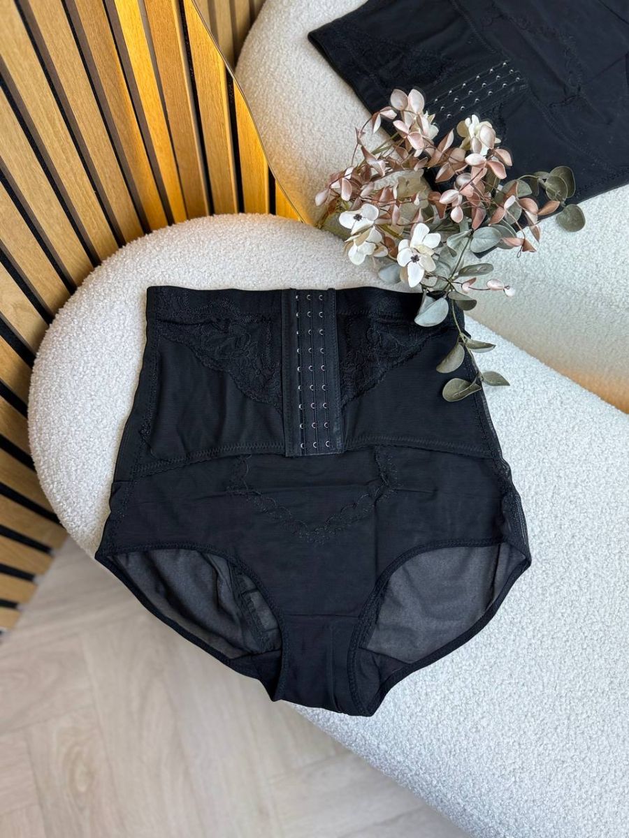 Коригуючі трусики-утяжка з високою талією з мікросітки. Подвійний шар у зоні живота забезпечує ефективне моделювання, а фронтальна застібка на гачках створює додаткову фіксацію та комфорт.