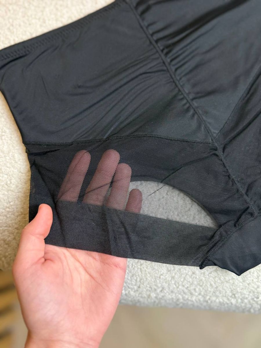 Широкі бокові панелі забезпечують зручну посадку без тиску, а вставка з мікросітки в зоні сідниць додає м’якості та підтримки. У передній частині передбачена посилена підкладка із сітки, яка створює легкий утягуючий і моделюючий ефект, підкреслюючи природні лінії фігури.