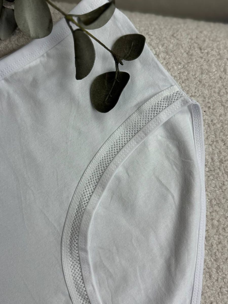 Акуратні вирізи для ніг спереду доповнені вставками з міцної сітки, яка добре тримає форму та додає виробу сучасного вигляду. Модель оснащена ластовицею для додаткового комфорту та гігієнічності.