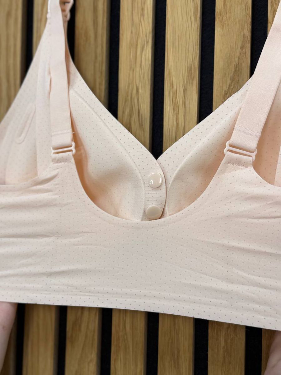 Комфортний безшовний бюстгальтер для годування з відстібними чашками та передньою застібкою. М’який, дихаючий матеріал без кісточок забезпечує зручність і підтримку щодня.