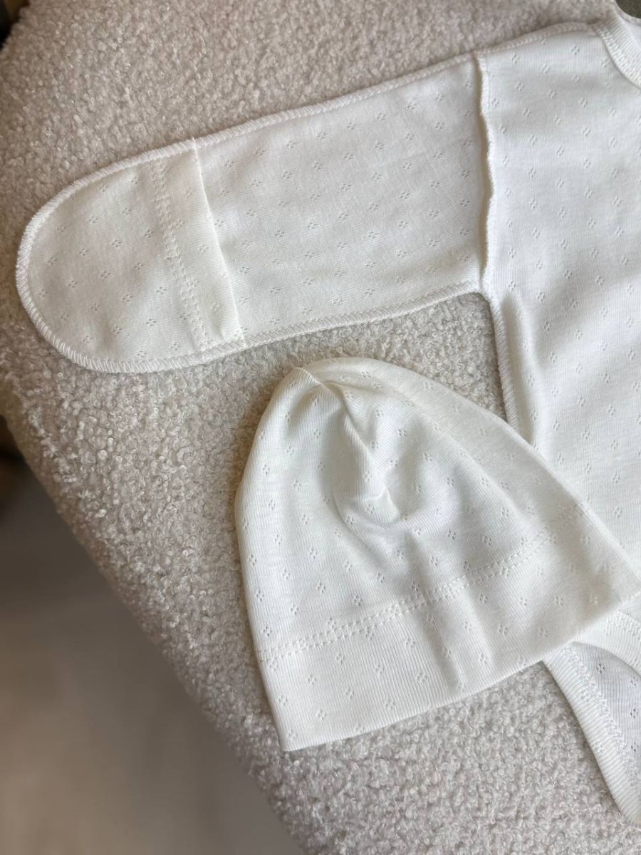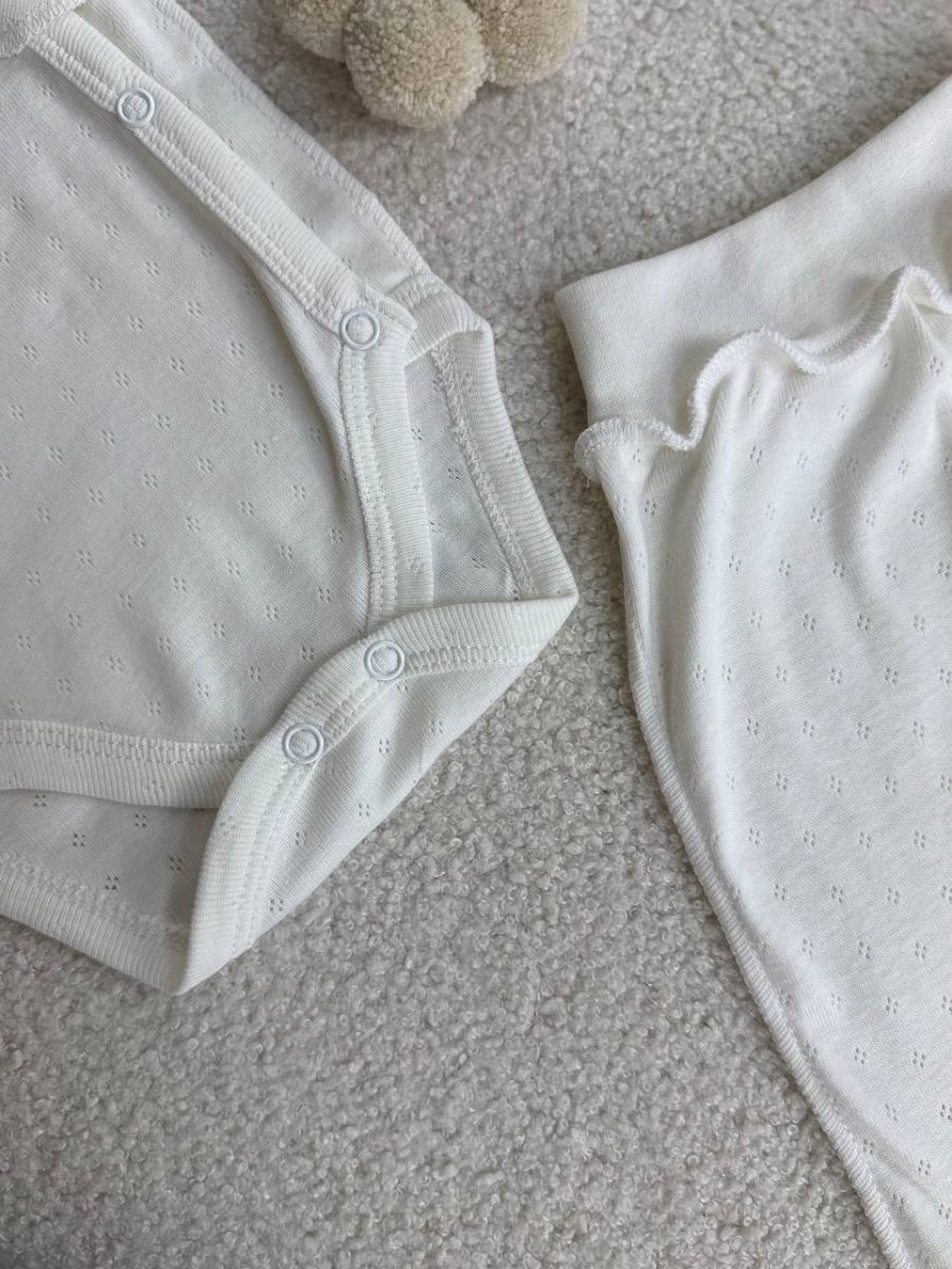 Ідеальний вибір для перших днів життя малюка — поєднання комфорту, практичності та ніжності. Комплект виконаний із натуральної бавовни з делікатною перфорацією, яка дозволяє шкірі дихати та підтримує оптимальний мікроклімат.