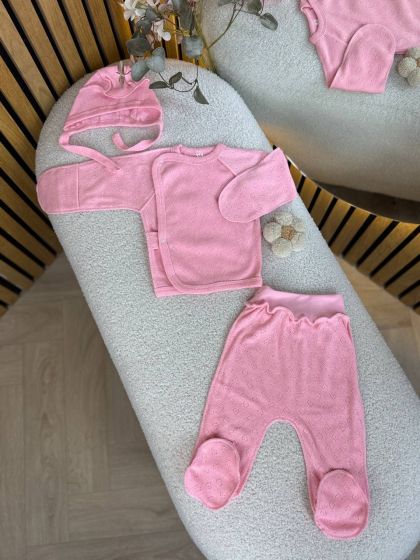Ідеальний вибір для перших днів життя малюка — поєднання комфорту, практичності та ніжності. Комплект виконаний із натуральної бавовни з делікатною перфорацією, яка дозволяє шкірі дихати та підтримує оптимальний мікроклімат.