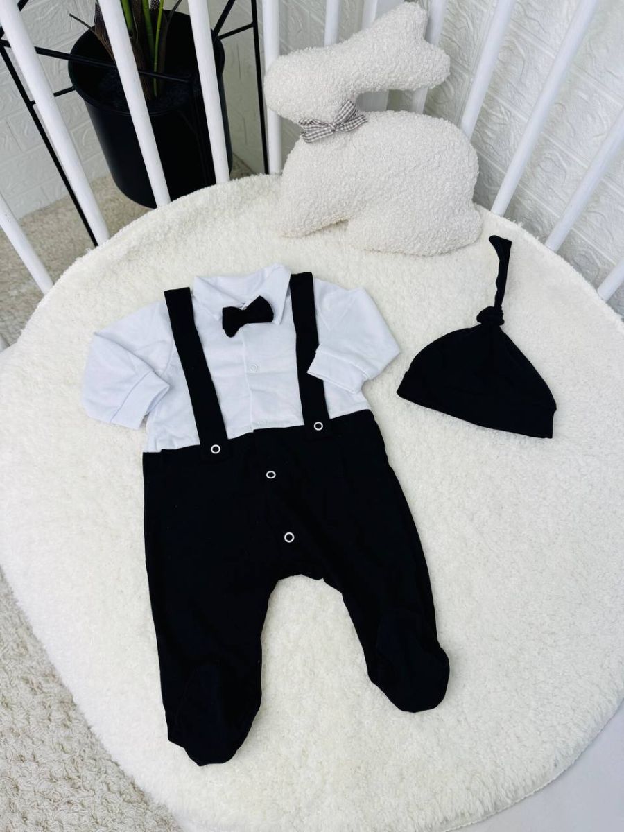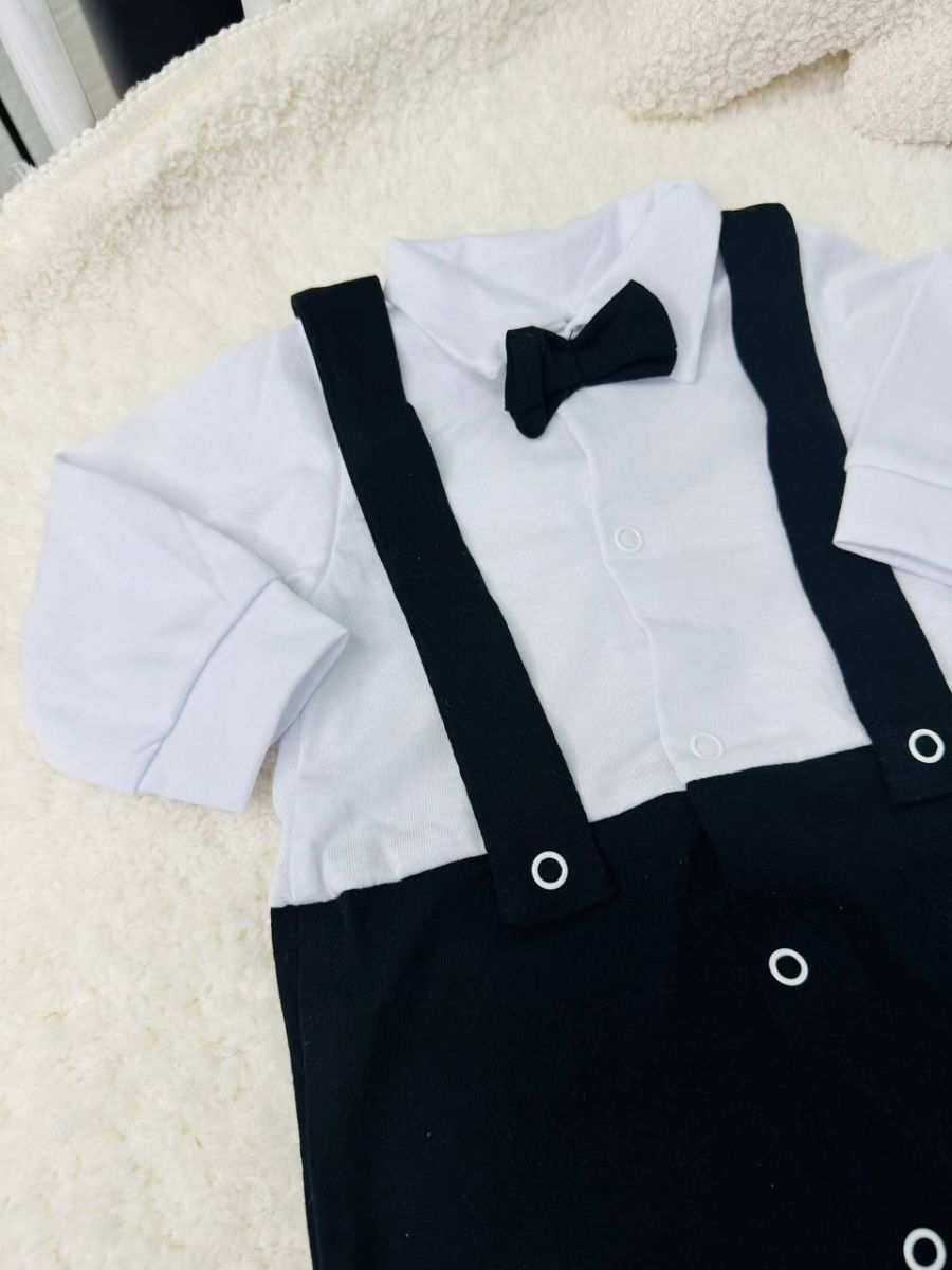 Дизайн «Все в одному»: Це цільний комбінезон (чоловічок), який імітує повноцінний костюм із сорочкою, підтяжками та метеликом. Завдяки такому крою одяг не збивається, спинка завжди закрита, а малюк виглядає охайно навіть під час активних рухів.