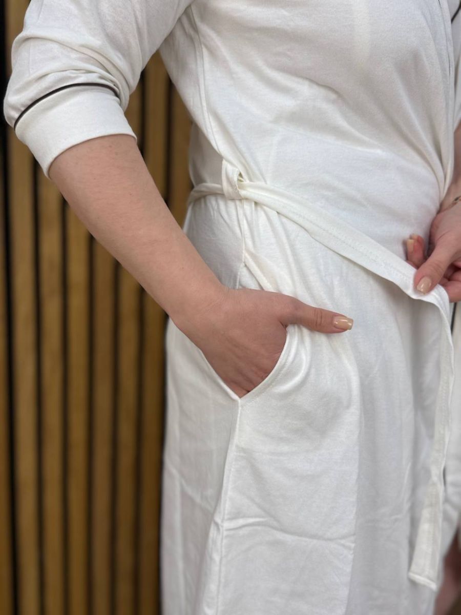 Халат доповнює комплект і створює затишний домашній образ. Модель із поясом добре сідає по фігурі, не обмежує рухів та підкреслює жіночність. Натуральна бавовна легка, приємна до тіла й чудово підходить для щоденного носіння.
