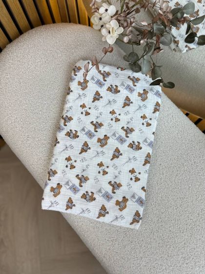 Пелюшки муслінові чотирьохшарові, жатка. Принт - Ведмедик в піжамці. Розмір - 90*135см