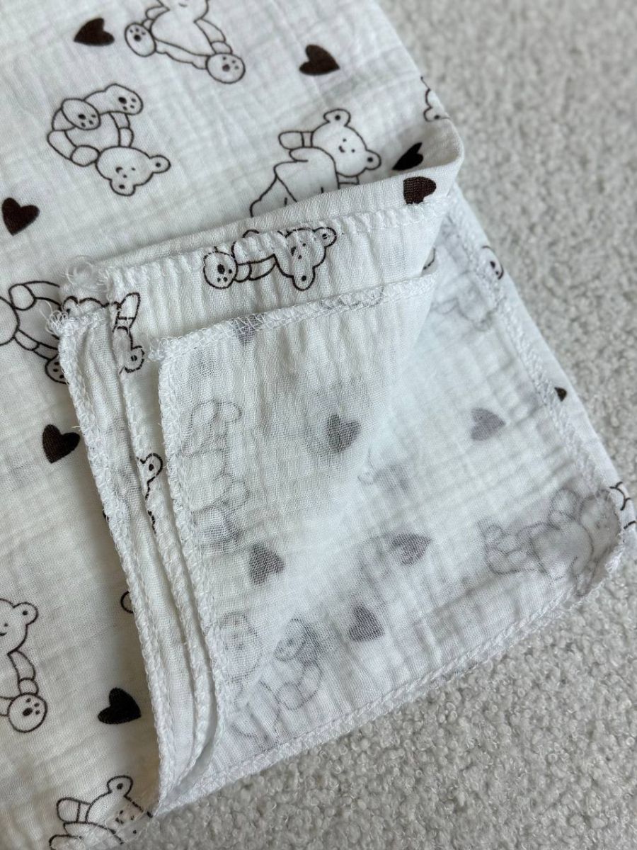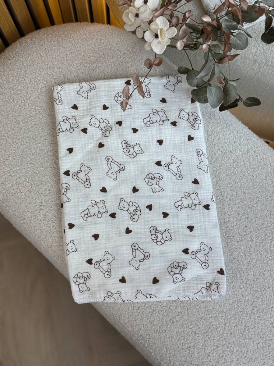 Пелюшки муслінові чотирьохшарові, жатка. Принт - Ведмедики контурні з сердечками. Розмір - 90*135см