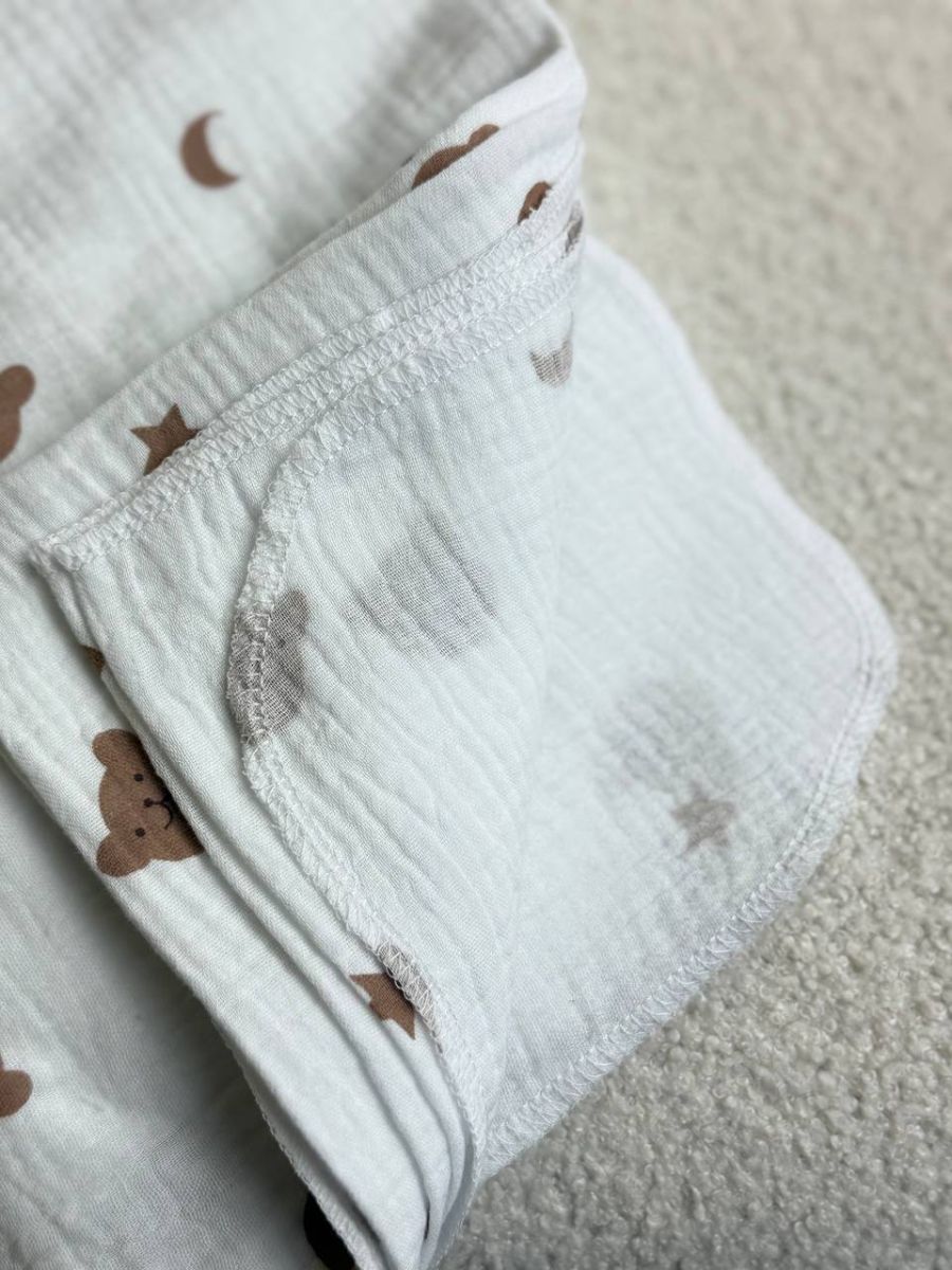 • Прання: Пелюшки та пледи з натуральних тканин (бавовна, муслін, фланель) рекомендується прати при температурі не вище 40°C, ручне прання. Це допоможе зберегти їх м’якість і не порушити структуру волокон.