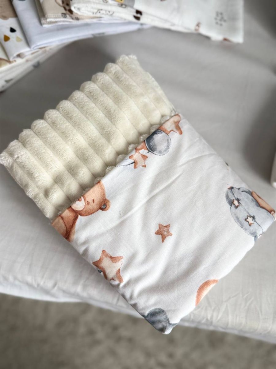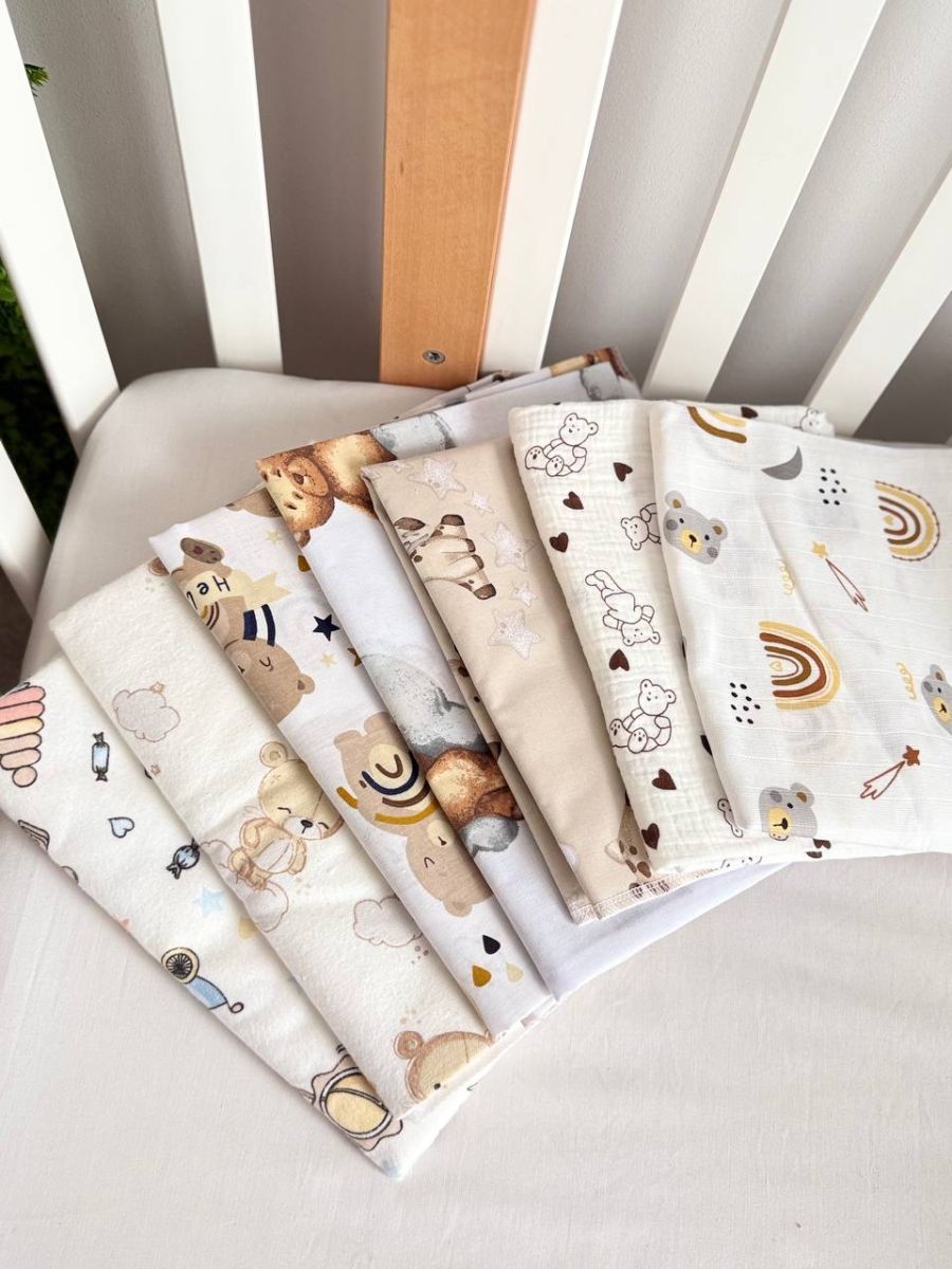 - Прання: Пелюшки та пледи з натуральних тканин (бавовна, муслін, фланель) рекомендується прати при температурі не вище 40°C, ручне прання. Це допоможе зберегти їх м’якість і не порушити структуру волокон.