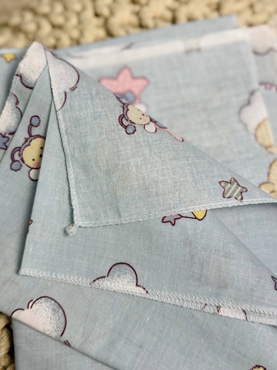 • Матеріал: Пелюшки виготовлені з натуральної бязі (ситцю) — легкого та міцного бавовняного матеріалу. Тканина добре пропускає повітря, що забезпечує оптимальну терморегуляцію малюка. Вона також гіпоалергенна та не подразнює ніжну шкіру дитини, що робить її ідеальним вибором для новонароджених.