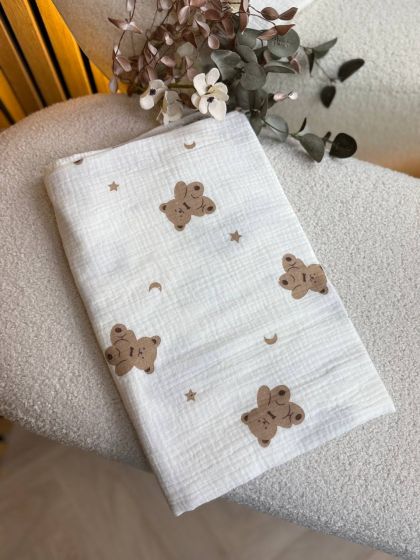 Пелюшки муслінові чотирьохшарові, жатка. Принт - Ведмедик сидячий, місяць, зірки. Розмір - 90*135см