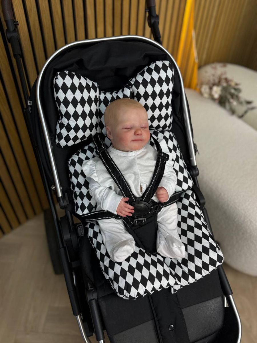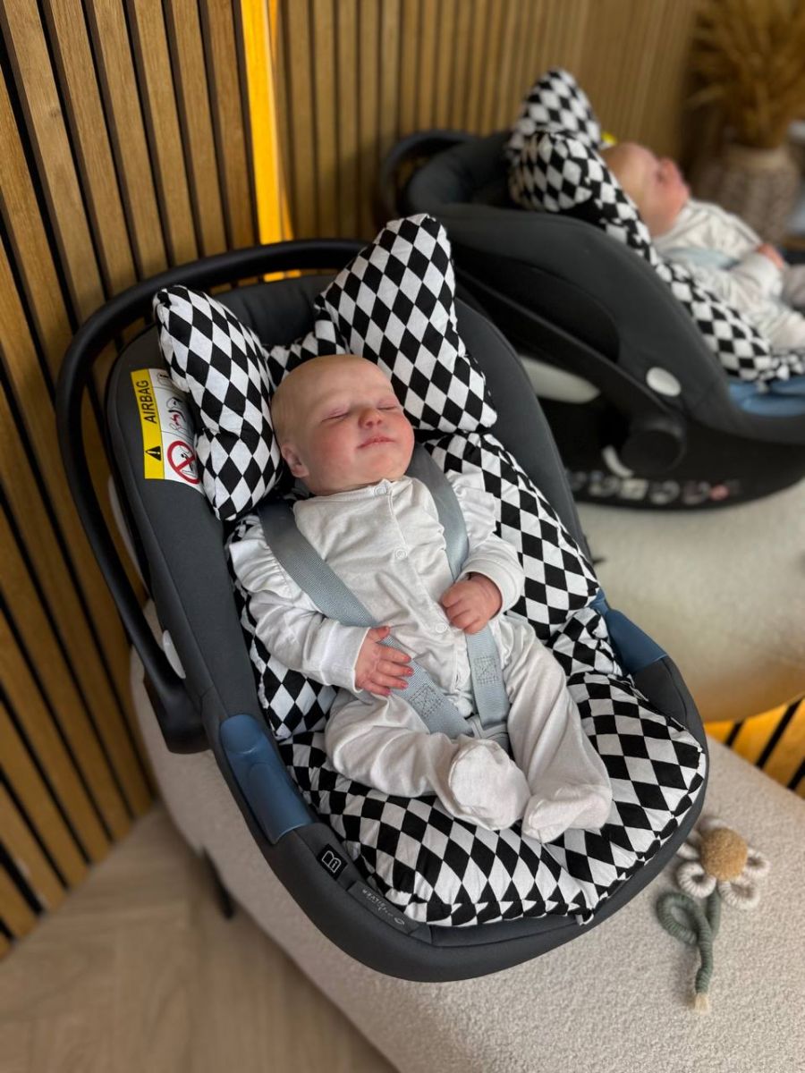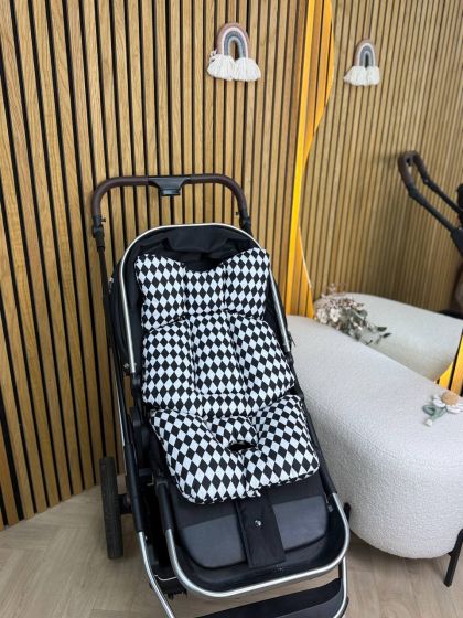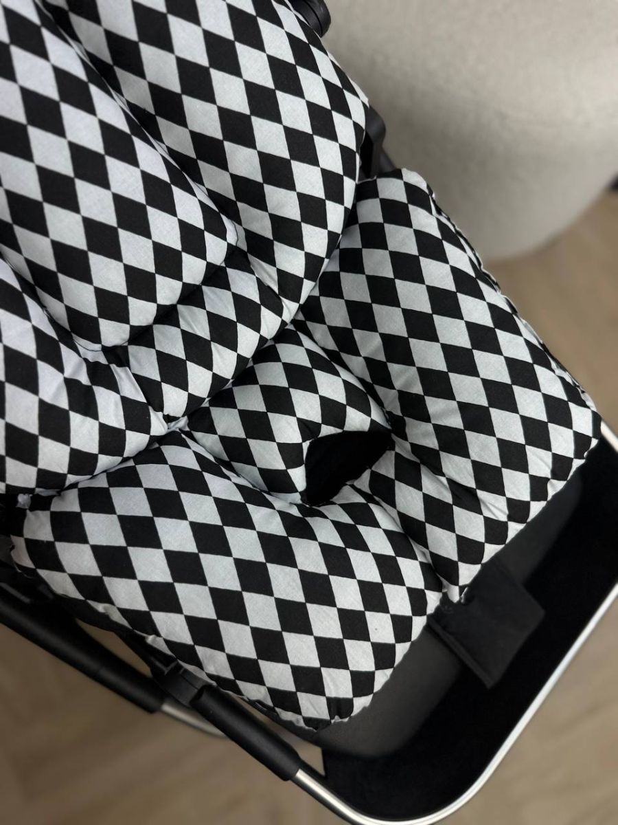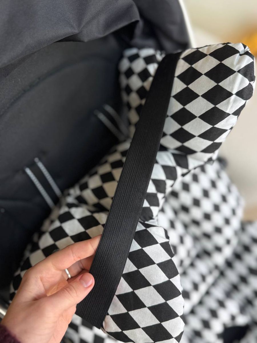 - Практичне кріплення: Гумка на зворотному боці забезпечує надійну фіксацію на колясці, а вирізи під 5-точкові ремені безпеки гарантують сумісність із різними моделями крісел.