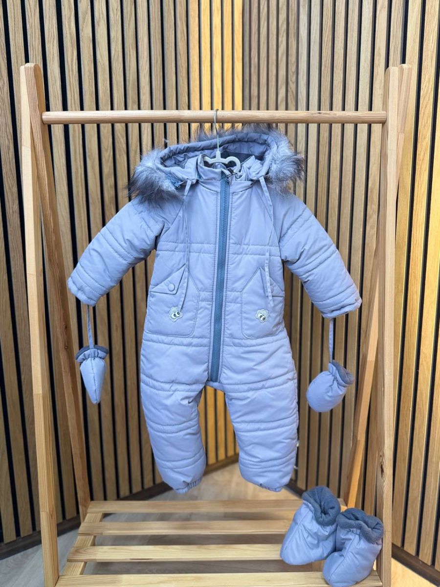 🎁 Комплектація: до комбінезона входять утеплені рукавички на зав'язках та пінетки-чобітки в тому ж стилі.