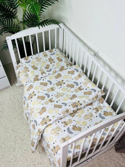 • Простирадло на резинці (120x60 см): Ідеально фіксується на матраці, не сповзає навіть під час активного сну малюка.
